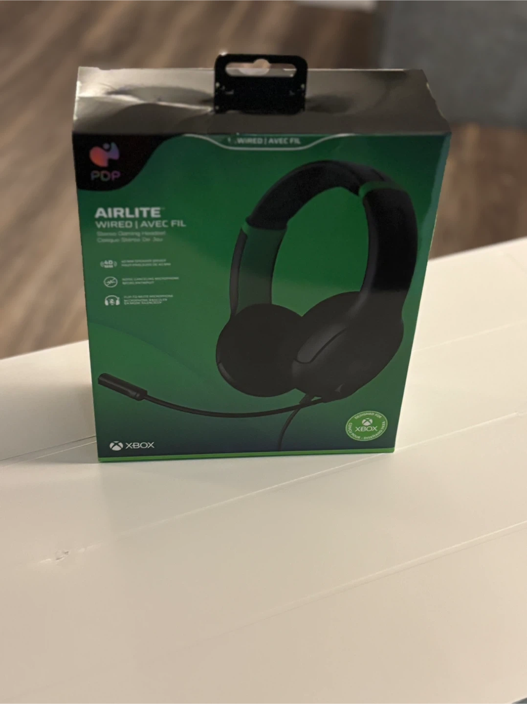 PDP AirLite wired stereo gaming headset. It features 40 mm speaker drivers and a noise-canceling microphone. This headset is designed for Xbox.