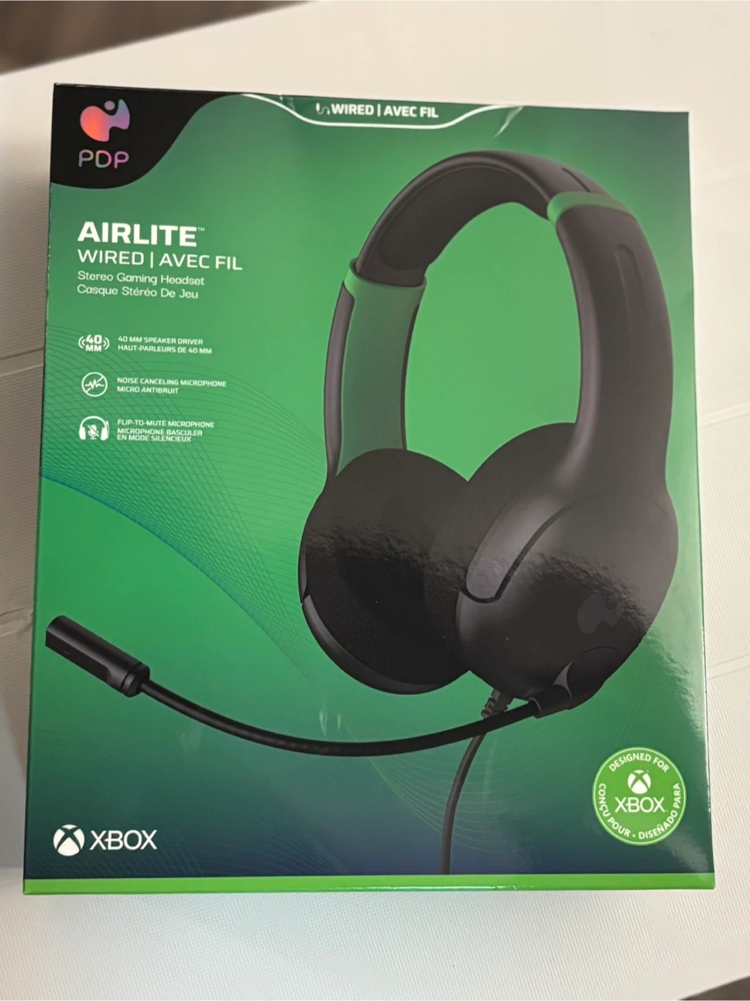 PDP AirLite wired stereo gaming headset. It features 40 mm speaker drivers and a noise-canceling microphone. This headset is designed for Xbox.