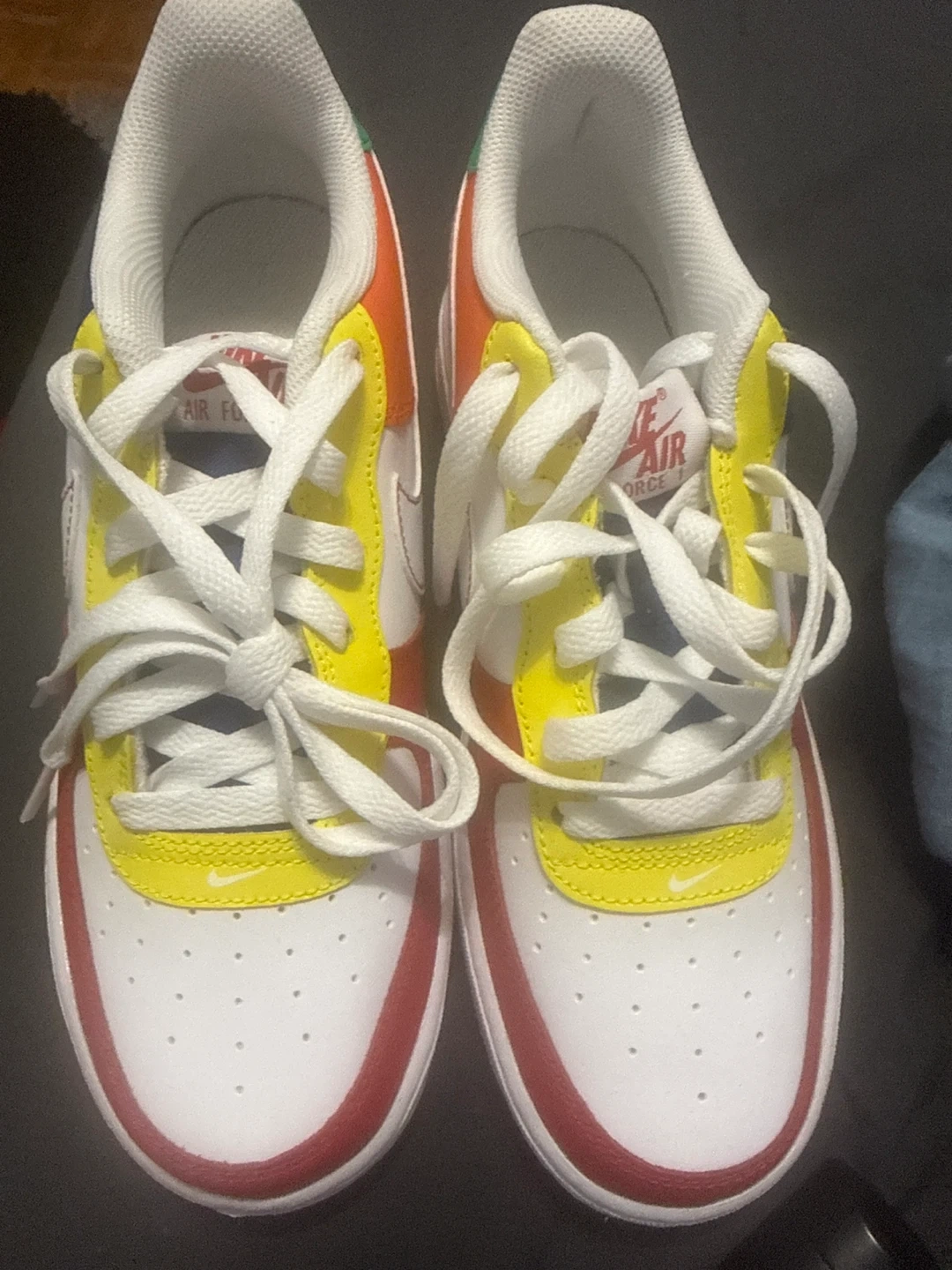 These are Nike Air Force 1 youth shoes in a white, red, yellow, blue, and green colourway. Classic design with comfortable cushioning. Good for everyday wear!