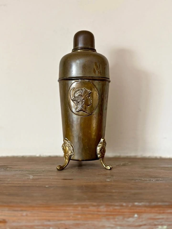 Beautiful Mid-Century Modern Italian brass cocktail shaker. This is a rare, footed Neoclassical design featuring a raised Roman Centurion medallion and ornate tripod scroll feet.