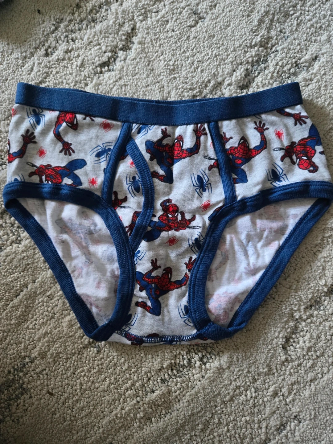 Four brand new pairs of kids Spider-Man underwear featuring Spidey designs and blue trim and cotton material for comfort.
