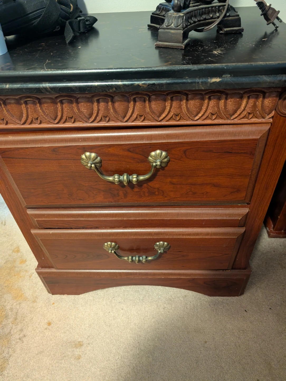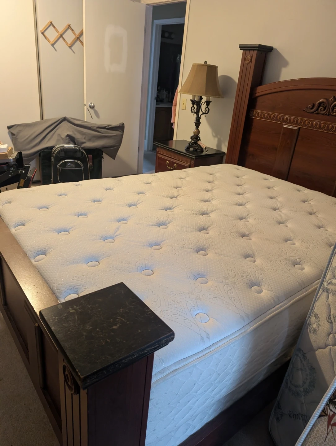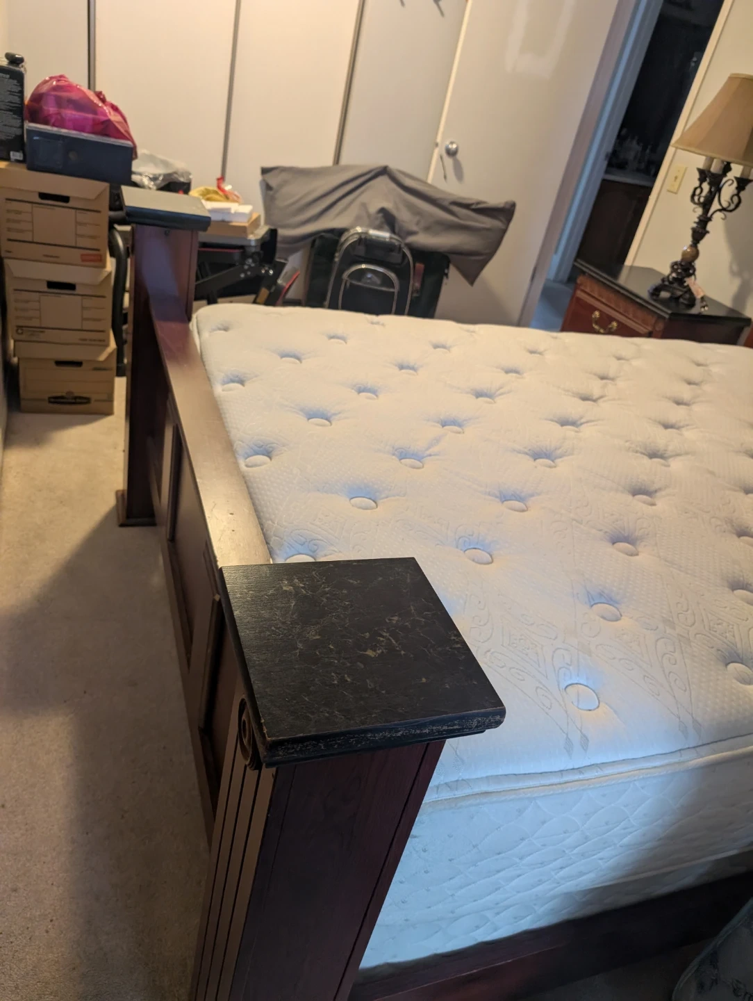 This is a sturdy wooden bed frame, dark wood finish. It includes a headboard with decorative carving and footboard ando matching nightstand. Mattress included. Bought at the Brick for over $1500.