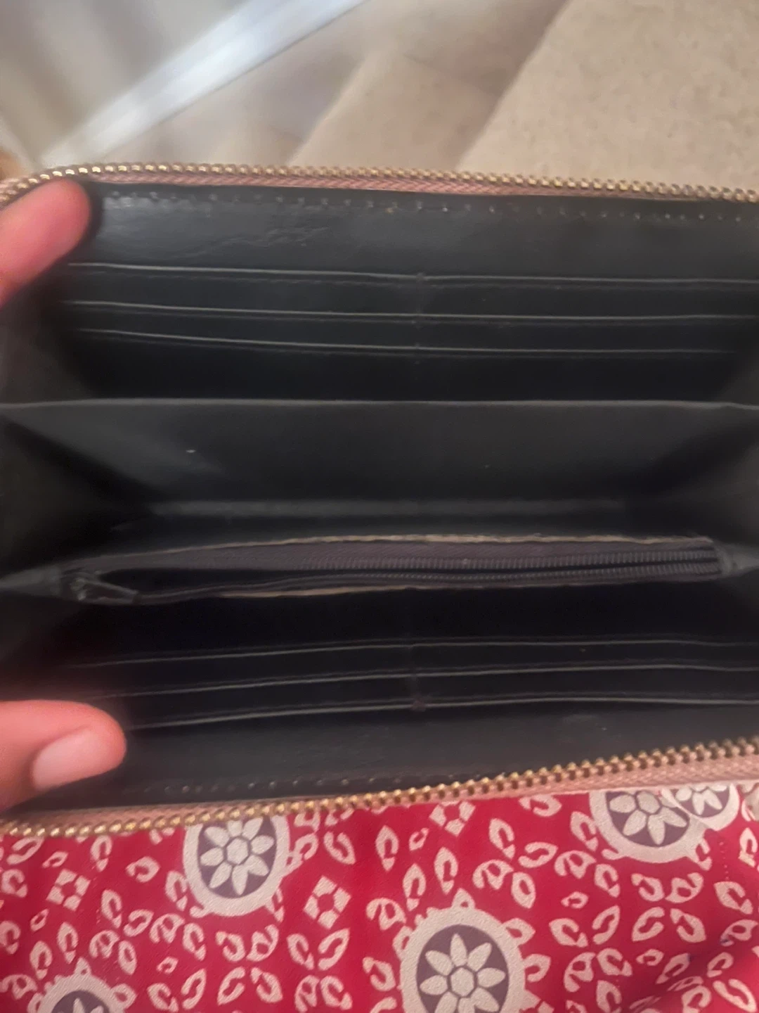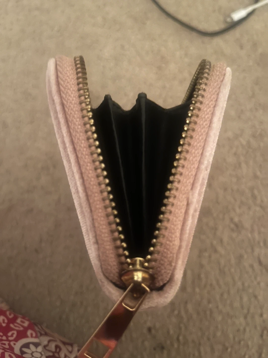 A soft pink velvet wallet with a zip-around closure. It has multiple card slots and a zippered coin pocket inside. Great for organizing your essentials!