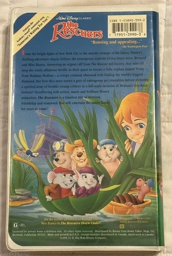 From the bright lights of New York City to the marshy swamps of the bayou, Disney's thrilling adventure classic follows the courageous exploits of two brave mice, Bernard and Miss Bianca. Answering an urgent call from The Rescue Aid Society, they take off atop the trusty albatross Orville in their quest to rescue a little orphan named Penny from Madame Medusa - a creepy criminal obsessed with finding the world's biggest diamond. But first they must outwit a pair of outrageous pet crocodiles before enlisting a spirited army of lovable swamp critters in a full-scale invasion of Medusa's riverboat fortress! Overflowing with action, music and brilliant Disney animation, The Rescuers is a timeless tale of heroism, friendship and teamwork that will entertain the entire family for years to come!