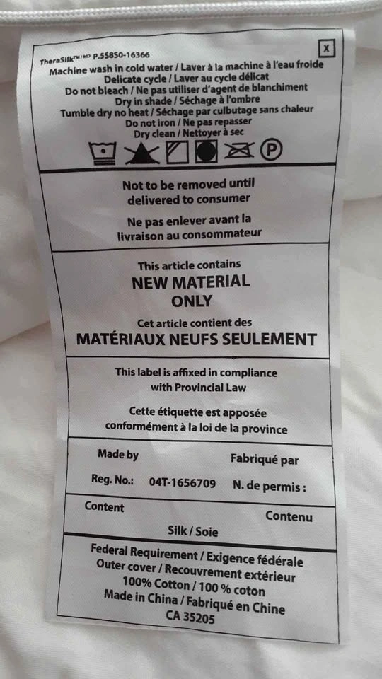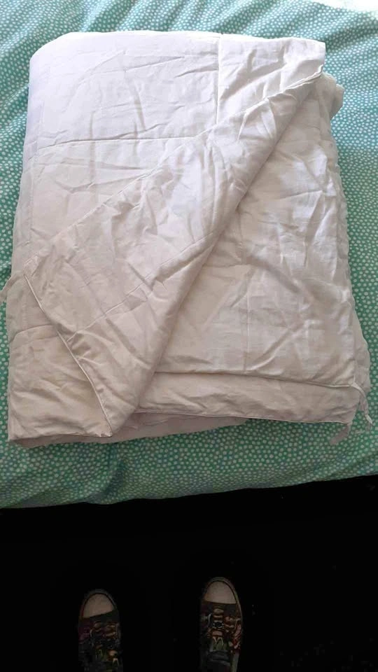 Very clean 100% silk filled duvet with cotton outer cover. Like new and can be machine washed in cold water on delicate cycle. Bonus cotton duvet cover, king-size in black and white print. Pickup in SW in Lakeview.
