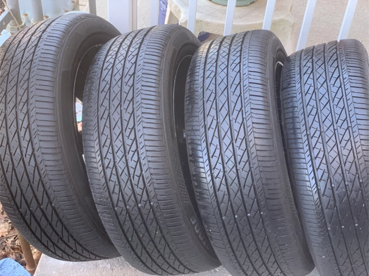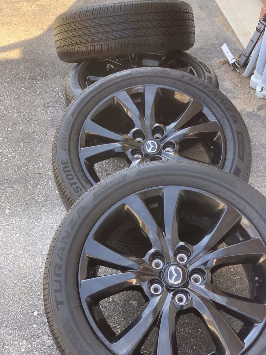 Four black alloy wheels from a Mazda vehicle, fitted with Bridgestone Turanza tires. The tires have a tread pattern suitable for various road conditions. These were removed from a Mazda CX-5.