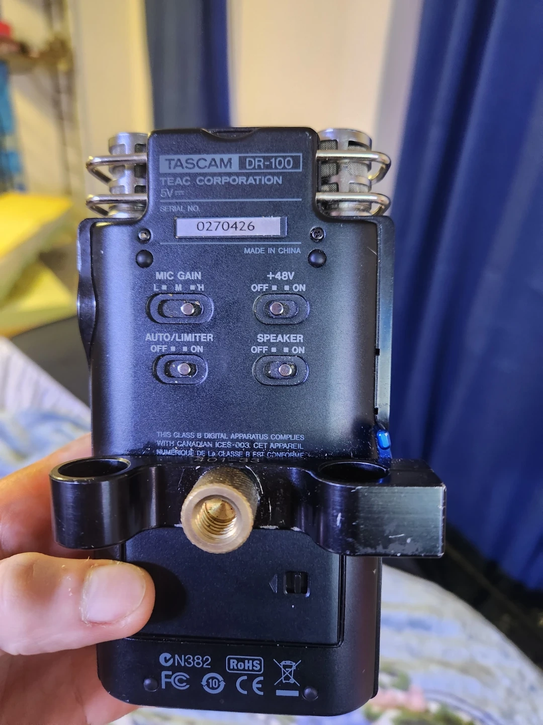 This is a Tascam DR-100 portable digital audio recorder. It features built-in uni mics and SD card slot. The recorder has multiple input options including XLR. It's great for capturing high-quality audio on the go!