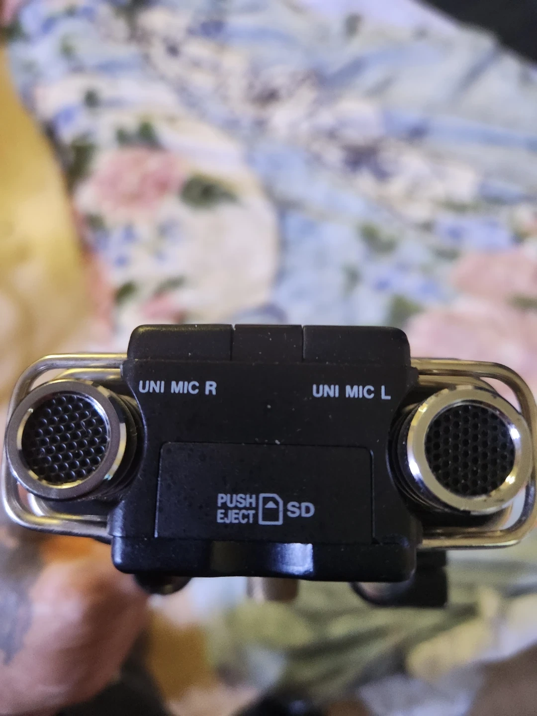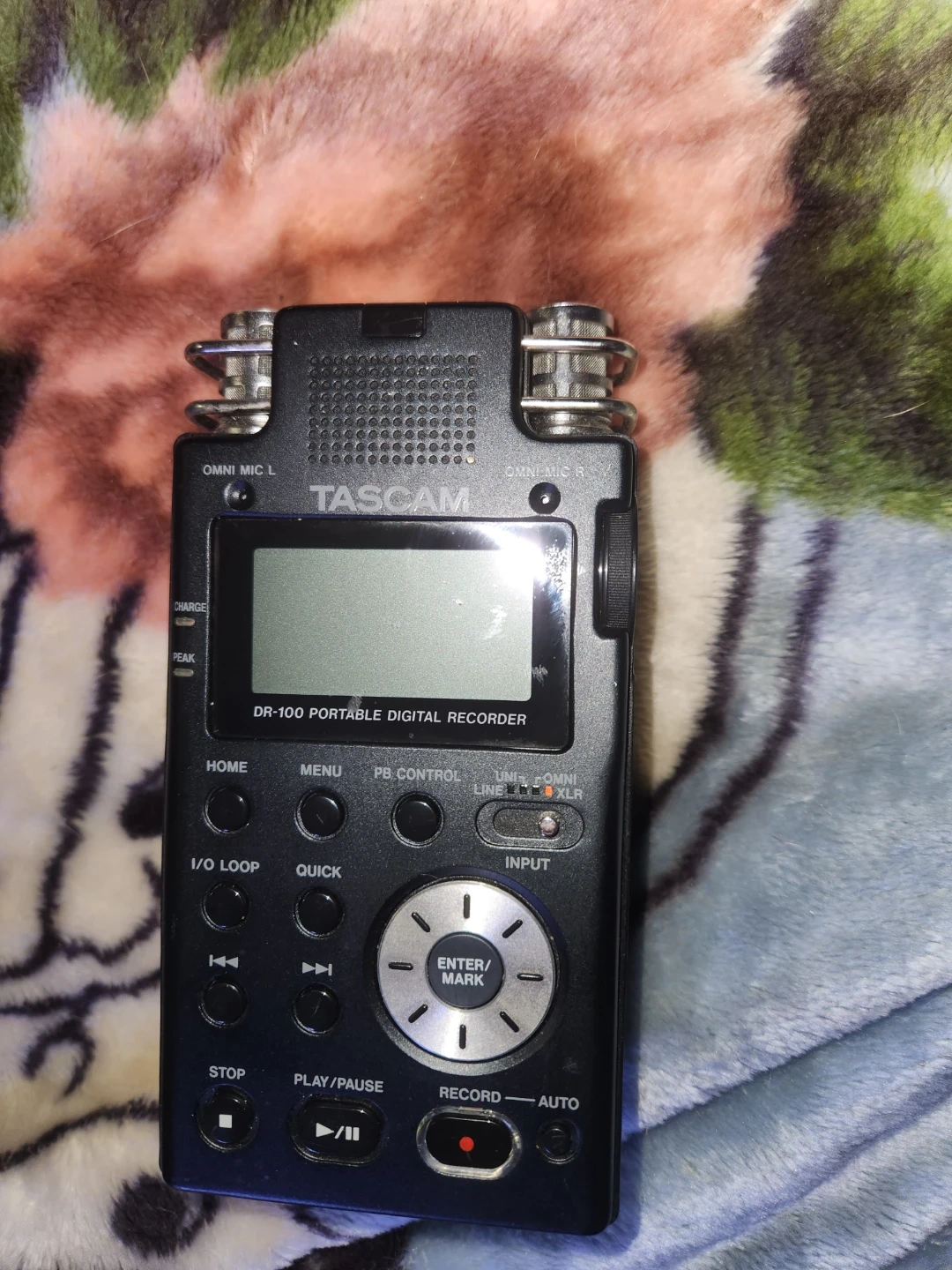 This is a Tascam DR-100 portable digital audio recorder. It features built-in uni mics and SD card slot. The recorder has multiple input options including XLR. It's great for capturing high-quality audio on the go!