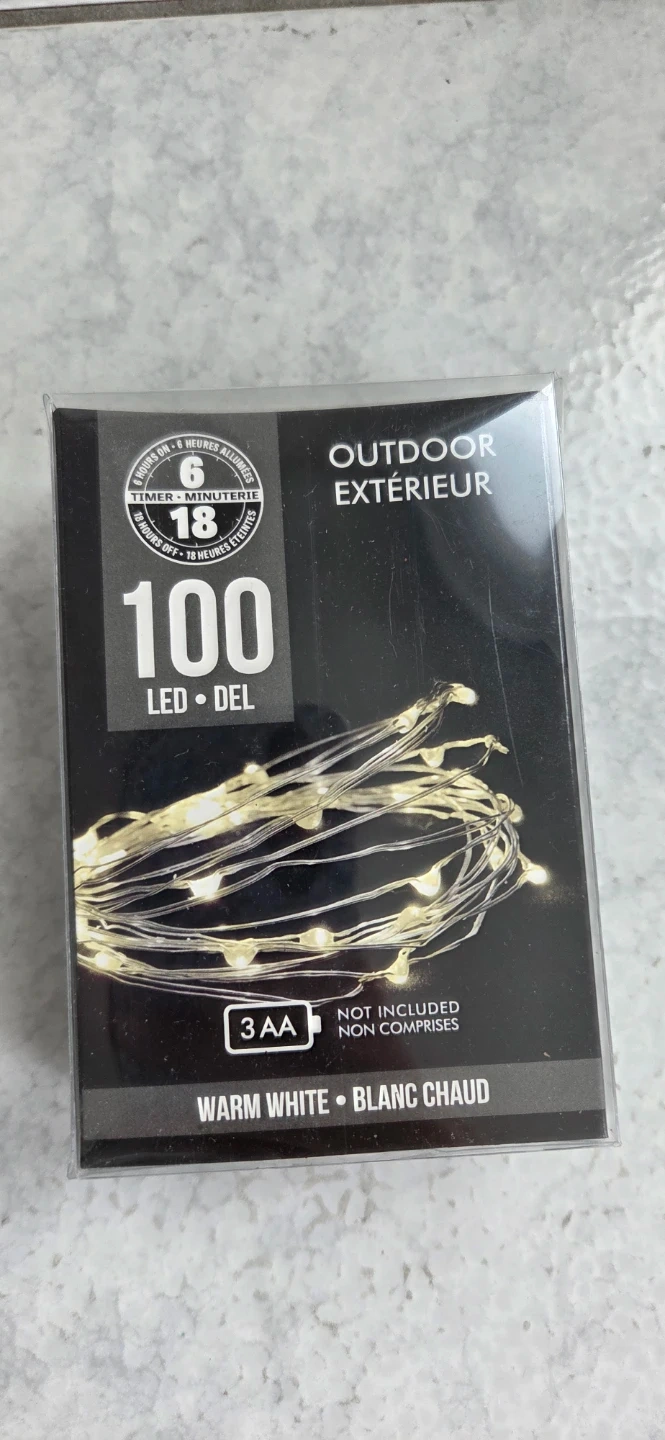 These outdoor LED string lights have 100 lights in a warm white colour. They feature a 6-hour timer and require 3 AA batteries, which are not included. Perfect for decorating your yard or patio for any occasion!