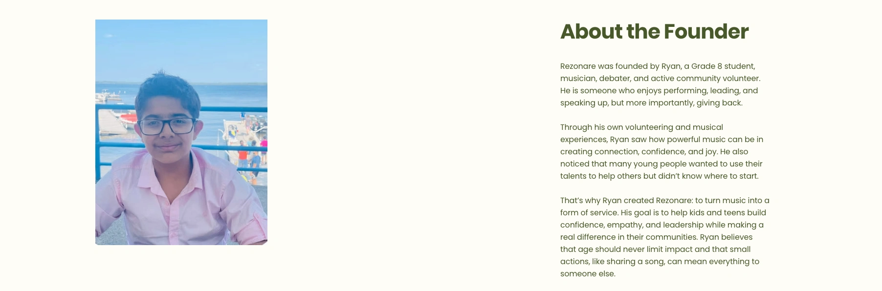 I’m a Winnipeg student in 8th Grade from St. John's Ravenscourt School and the founder of Rezonare, a youth-led nonprofit organization that connects young musicians with senior living homes to bring joy through music.