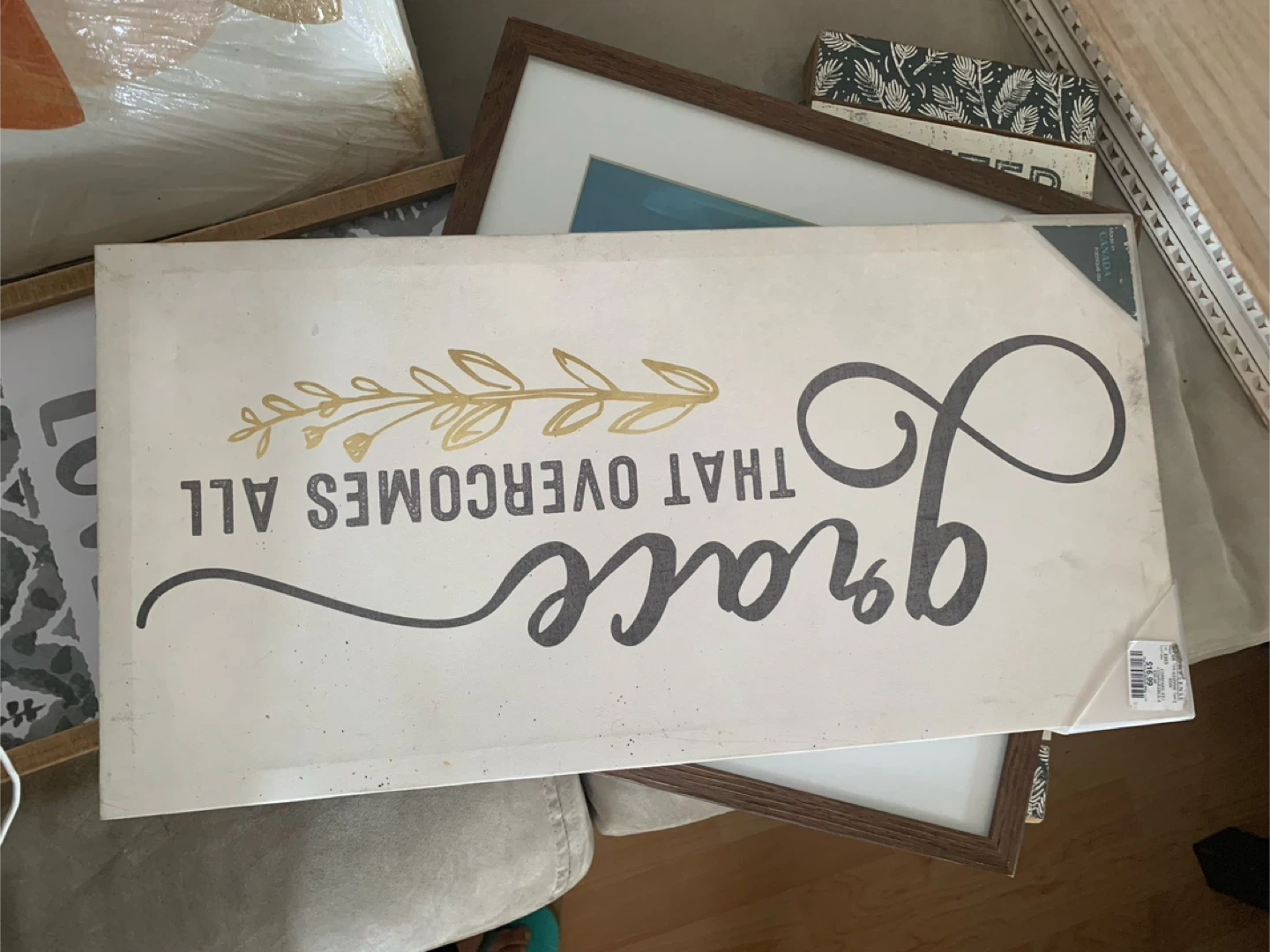 This decorative wall art plaque features the phrase 'Grace That Overcomes All' in elegant script and decorative accents. It's made of wood and has a distressed finish. This piece adds a touch of inspiration to any room!