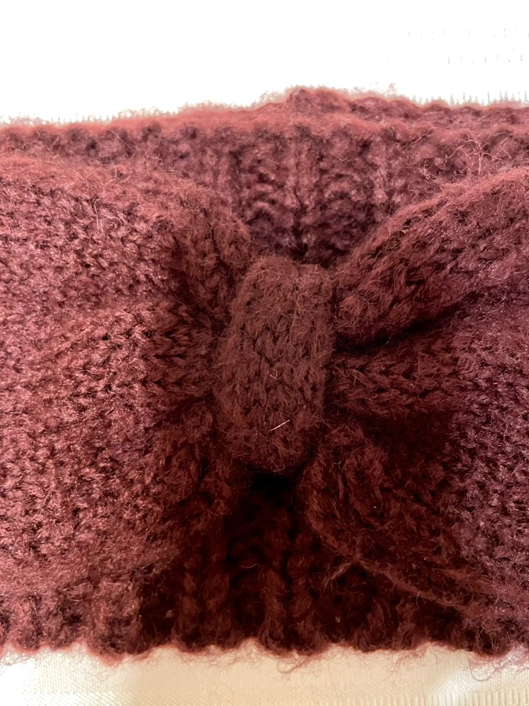Cozy knitted headband in a deep burgundy colour. It's designed with a cute knotted bow at the front. Made from a soft, fuzzy yarn, it'll keep your ears warm on chilly days. One size fits most. Excellent condition.