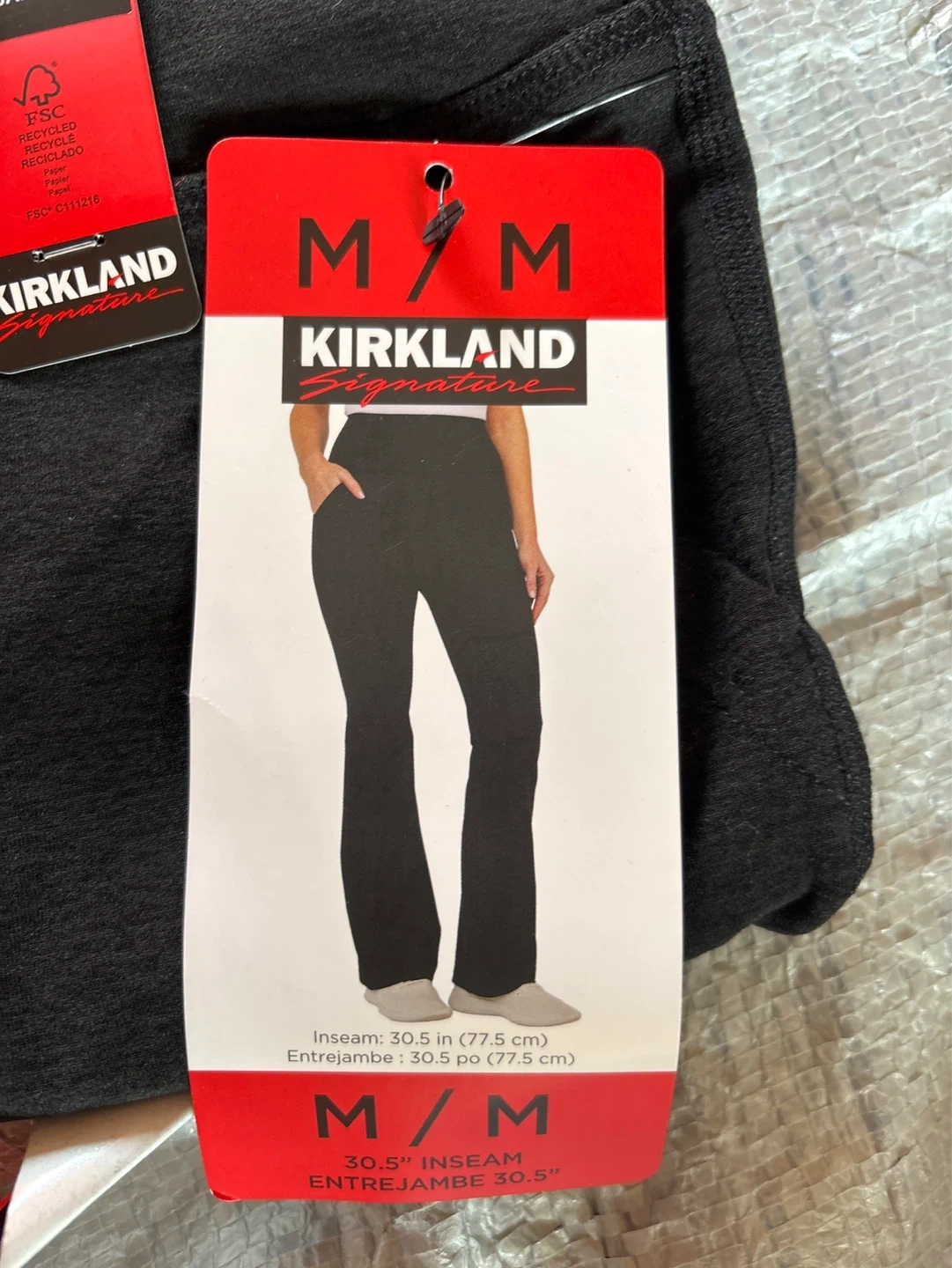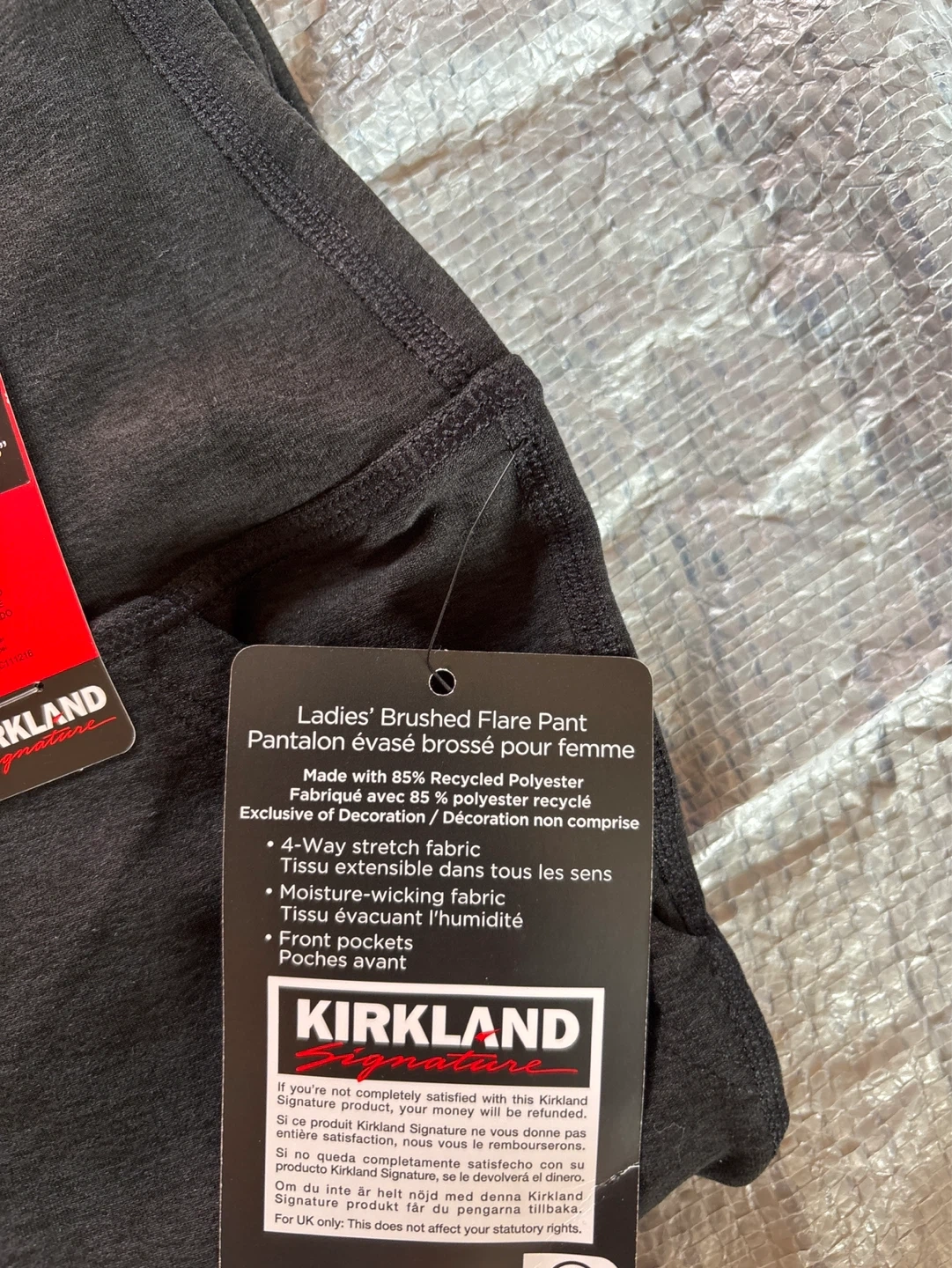 Kirkland Signature Ladies' Brushed Flare Pants. Made with 85% Recycled Polyester and 4-Way stretch fabric. These pants are moisture-wicking and feature front pockets. Inseam is 30.5 inches.