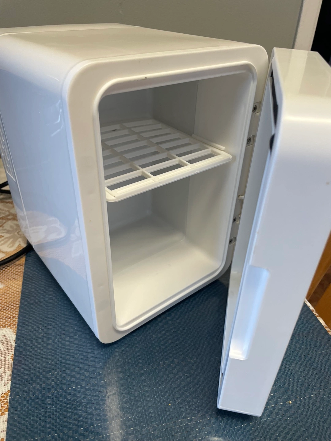 Portable mini fridge, perfect for skincare or beverages. Features a mirrored front with LED lighting. Includes one shelf. Operates on 100-240V. Cool or warm settings.