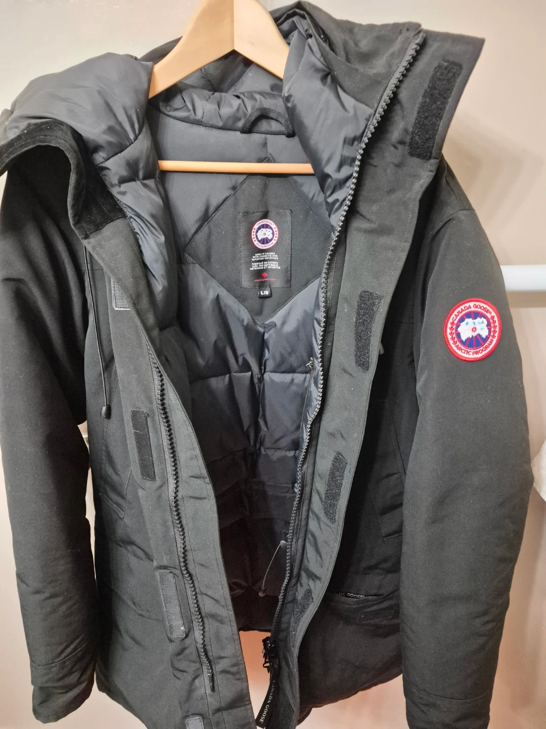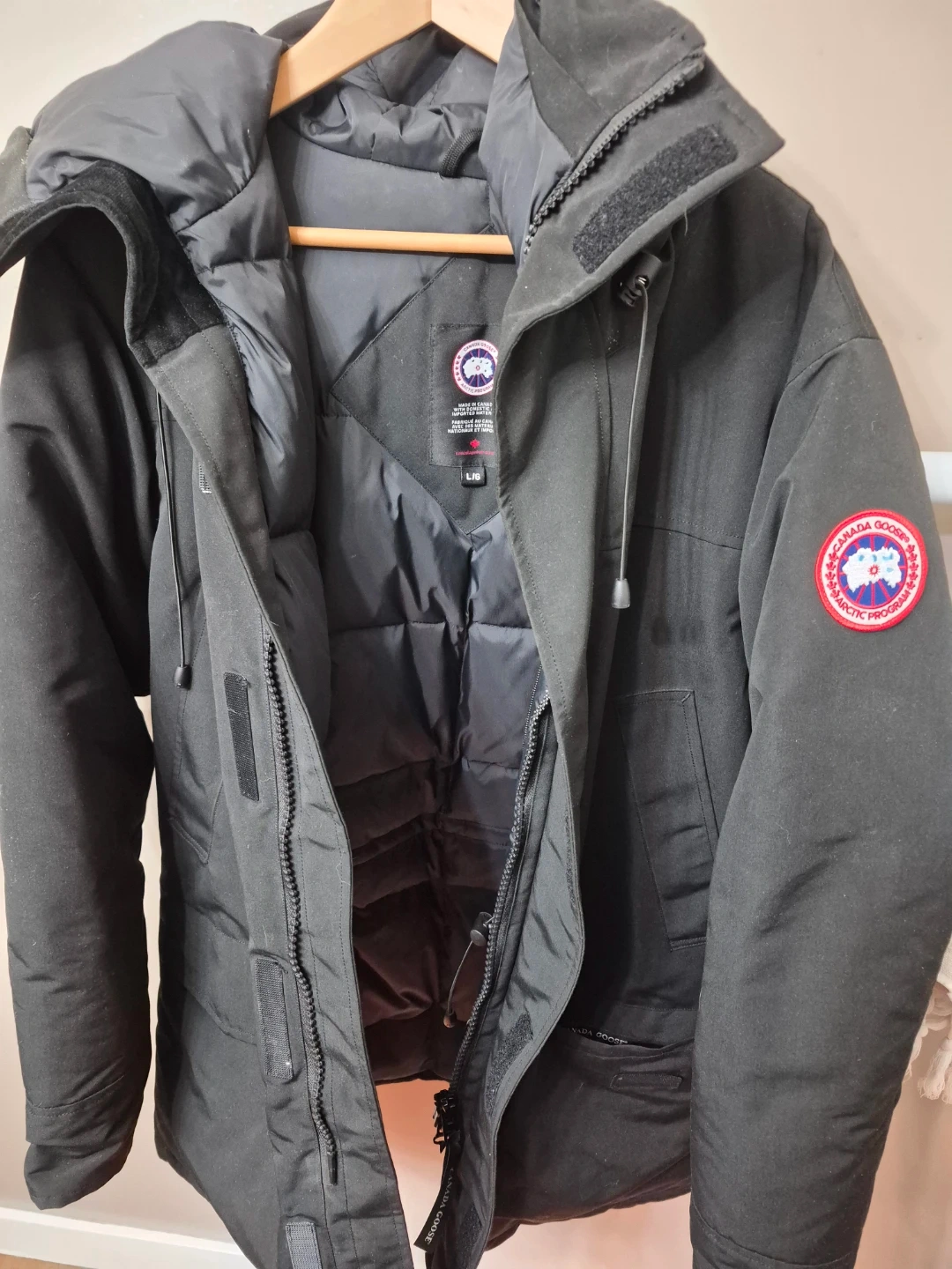 This is a black Canada Goose parka jacket. It's a size L. It's made with a durable outer shell and insulated for warmth.