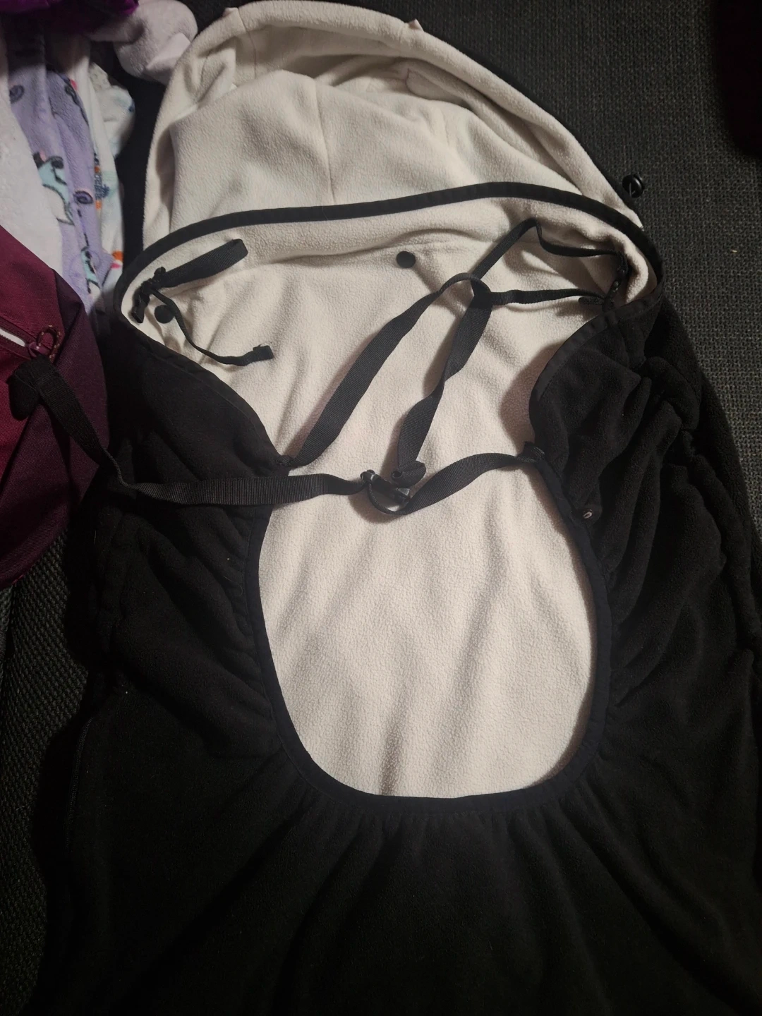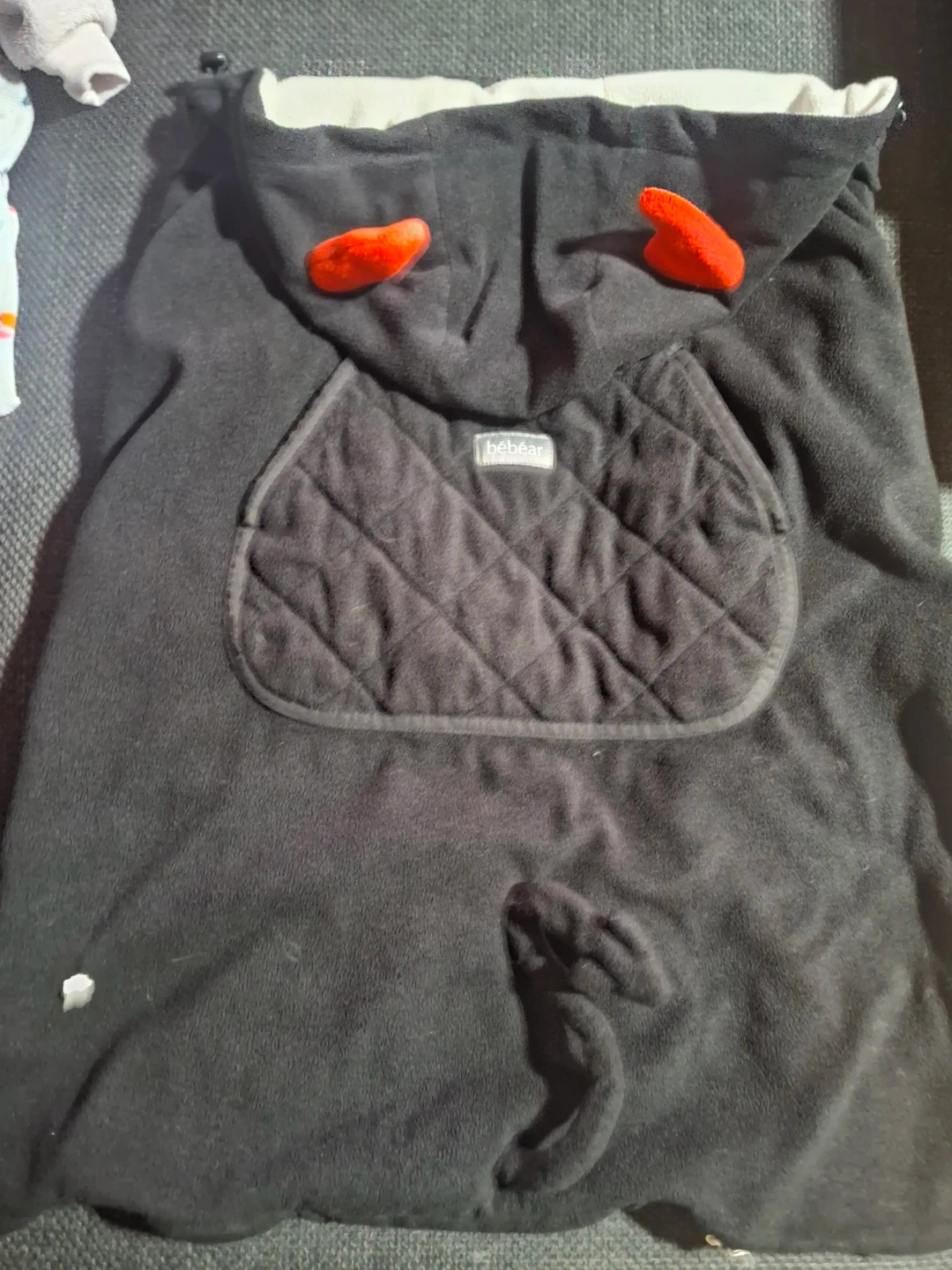 This Bébécar bunting is black and made of fleece with a white sherpa lining. It features a hood with two red pom-poms and a quilted front pocket. Drawstrings allow for a snug fit. Perfect for keeping little ones warm in their stroller! Or carrier has damage as in pictures but does not affect tge item at all