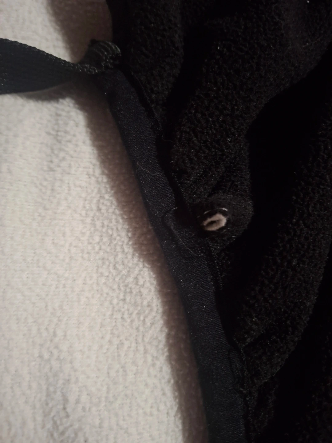This Bébécar bunting is black and made of fleece with a white sherpa lining. It features a hood with two red pom-poms and a quilted front pocket. Drawstrings allow for a snug fit. Perfect for keeping little ones warm in their stroller! Or carrier has damage as in pictures but does not affect tge item at all