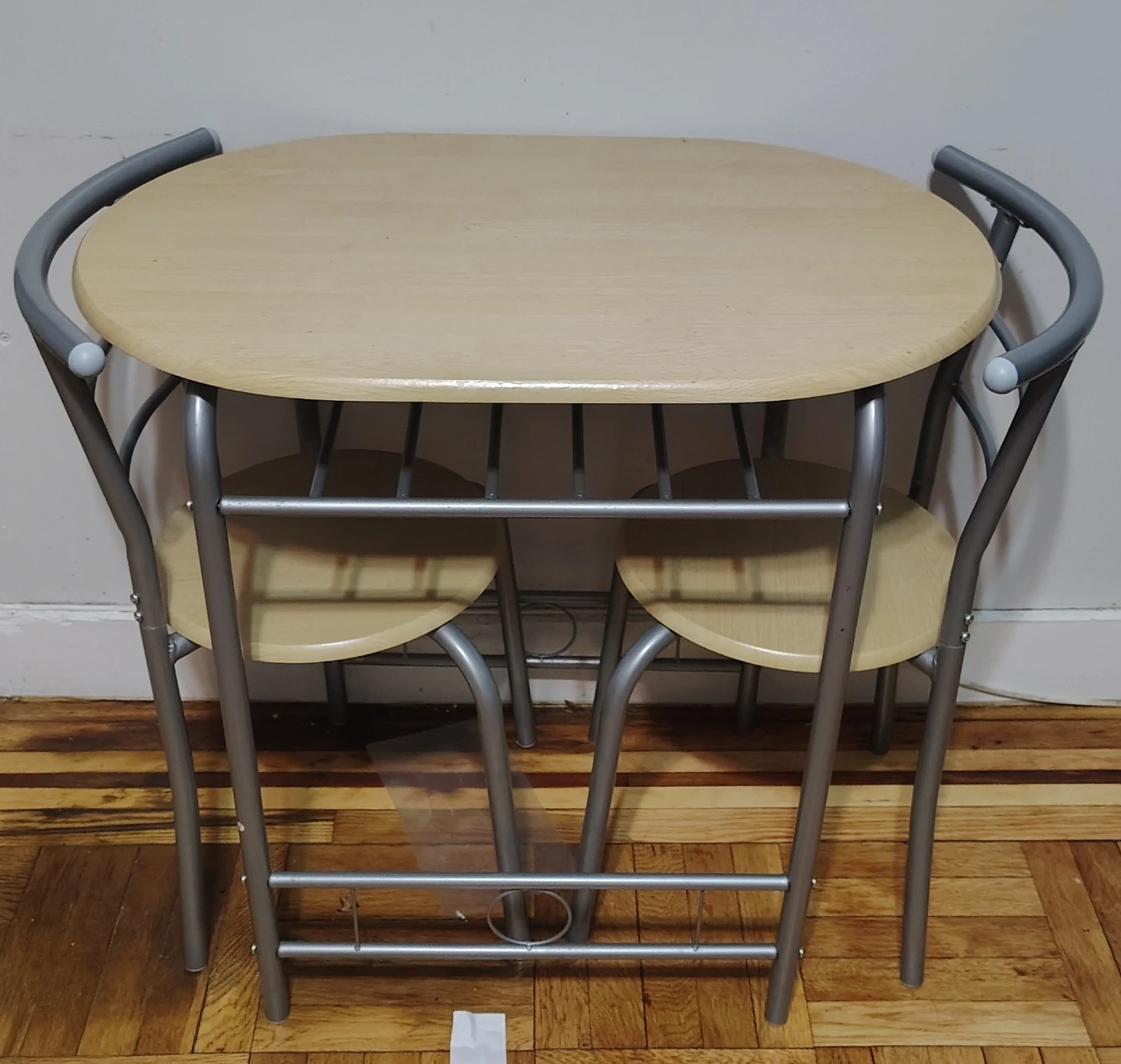 Selling a small kitchen table with two matching chairs. Perfect for a small apartment or breakfast nook. The table has a light wood-colored top and silver-colored metal legs. The chairs are the same style and color as the table. It's in good condition and ready for a new home!