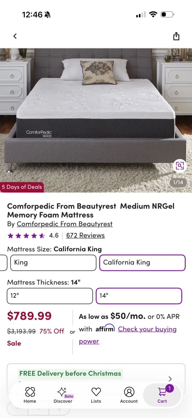 Selling a Comforpedic From Beautyrest firm NRGel Memory Foam Mattress. It's a California King size with a 14-inch thickness. The mattress features NRGel memory foam for resilient conformance and temperature control. Originally bought for $820.
