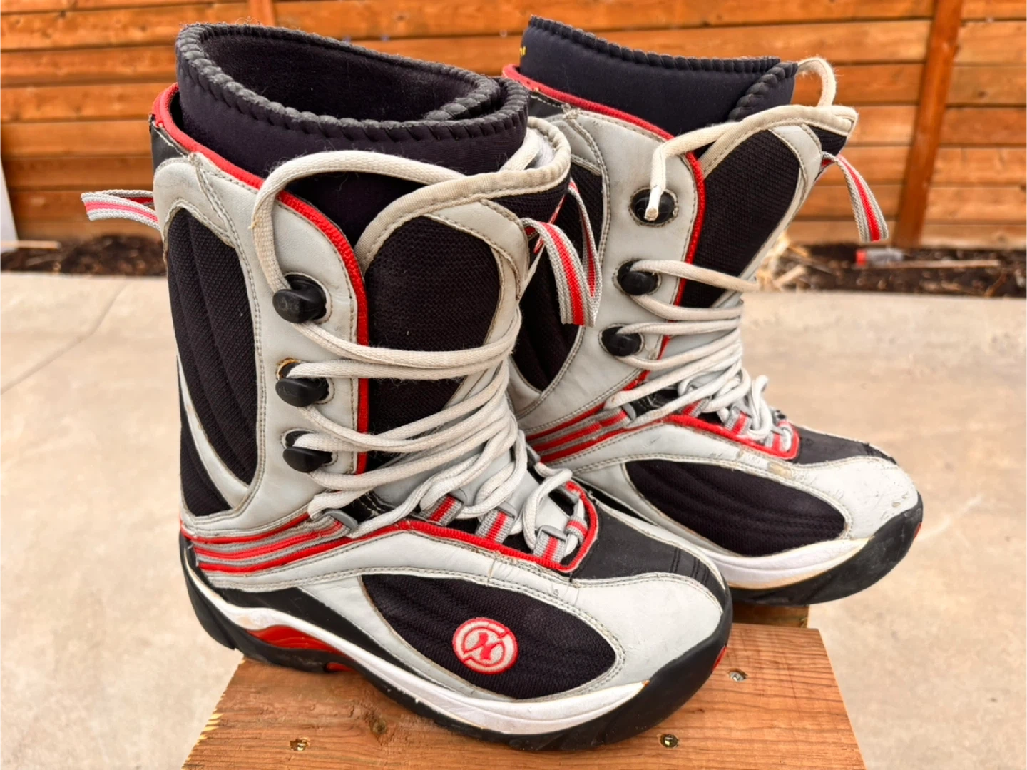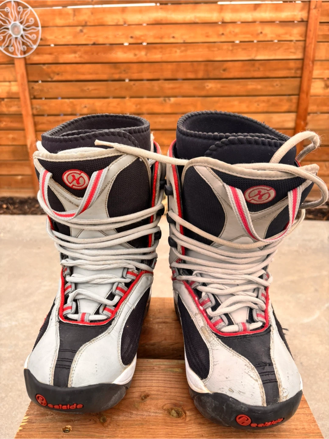 These Ride snowboard boots are black, grey, and red with a lace-up closure. They are size US Men's 8, EUR 41, UK 7, and CM 26. The outer is synthetic and balance is man-made materials. They're ready for the slopes!