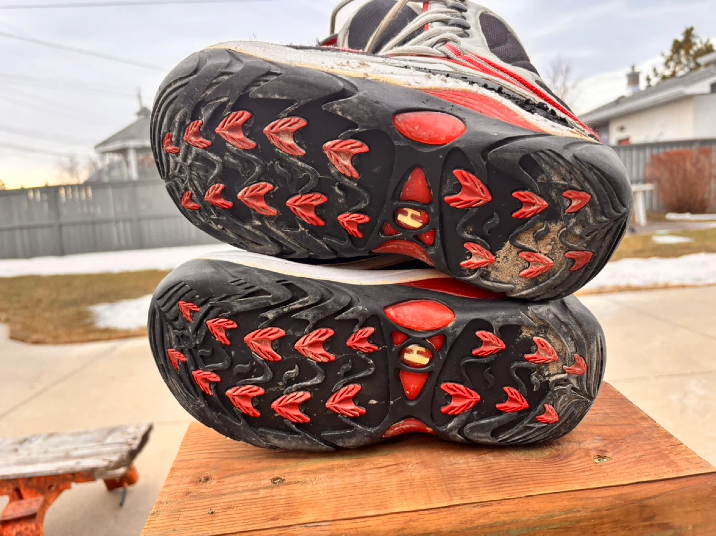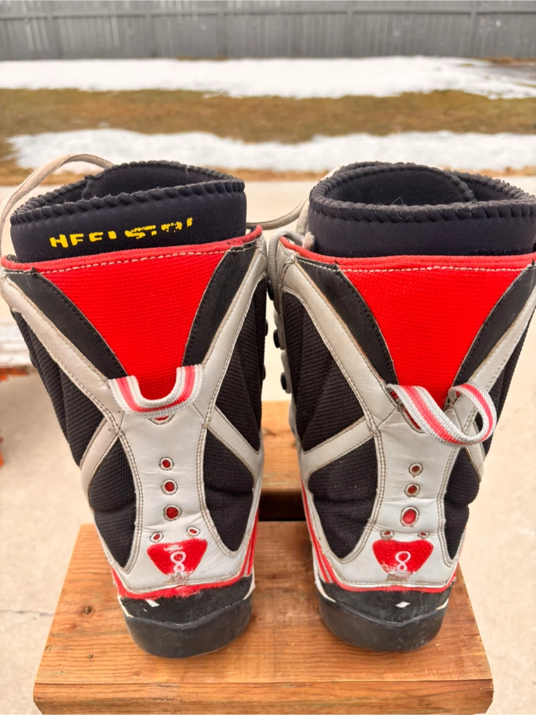 These Ride snowboard boots are black, grey, and red with a lace-up closure. They are size US Men's 8, EUR 41, UK 7, and CM 26. The outer is synthetic and balance is man-made materials. They're ready for the slopes!