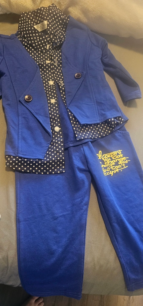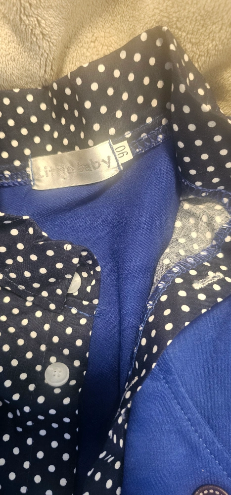 Adorable three-piece outfit for baby boys. Includes a blue blazer, collared shirt with polka dots, and matching pants. Perfect for special occasions or photoshoots. Size 90.