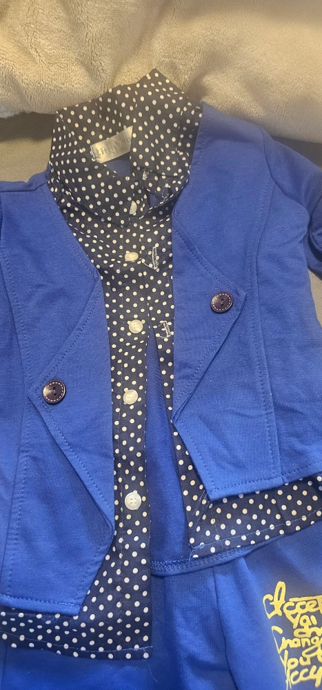 Adorable three-piece outfit for baby boys. Includes a blue blazer, collared shirt with polka dots, and matching pants. Perfect for special occasions or photoshoots. Size 90.