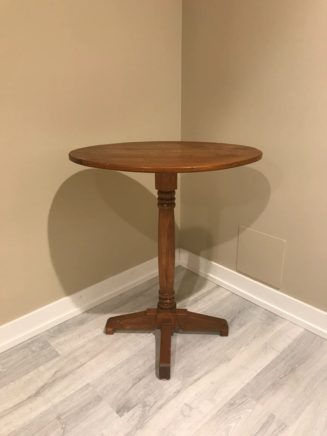 This is a lovely wooden pedestal table with an oval top. It's made of solid wood with a warm, stained finish. The table's design makes it a nice accent piece for a corner.