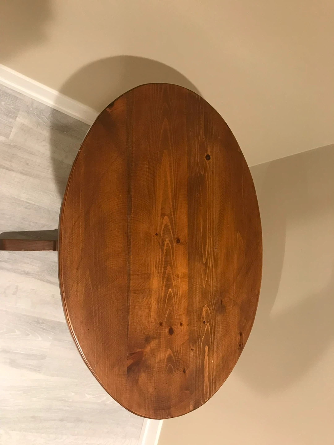 This is a lovely wooden pedestal table with an oval top. It's made of solid wood with a warm, stained finish. The table's design makes it a nice accent piece for a corner.
