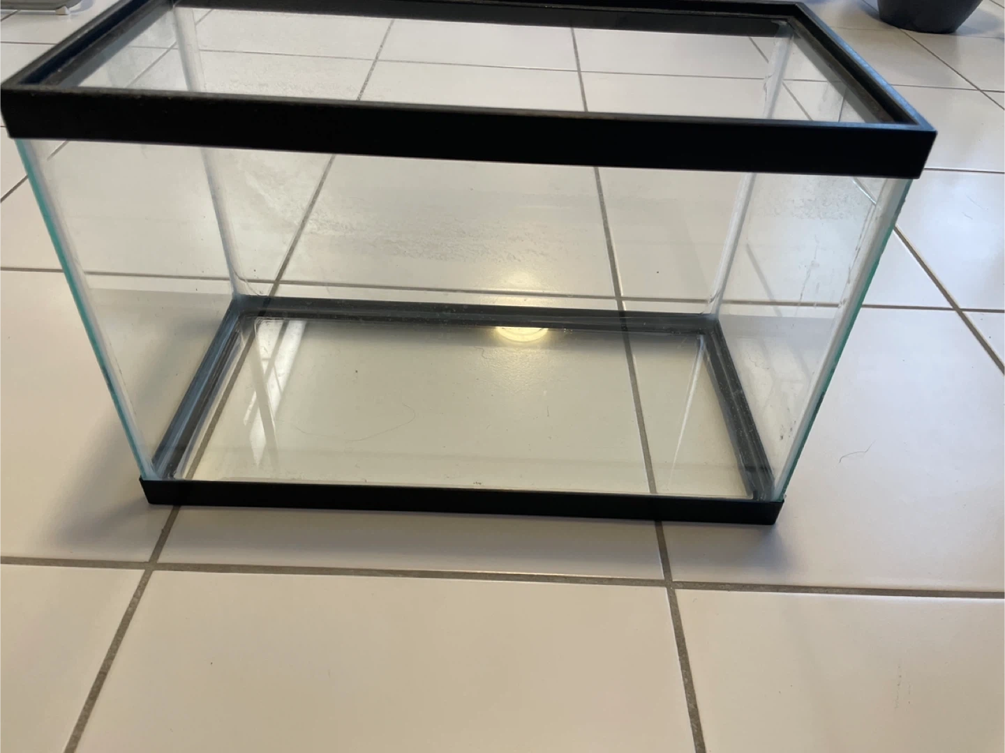This is a standard glass aquarium tank with a black plastic rim. It's suitable for small fish or as a terrarium. The tank has a slight chip on one corner.