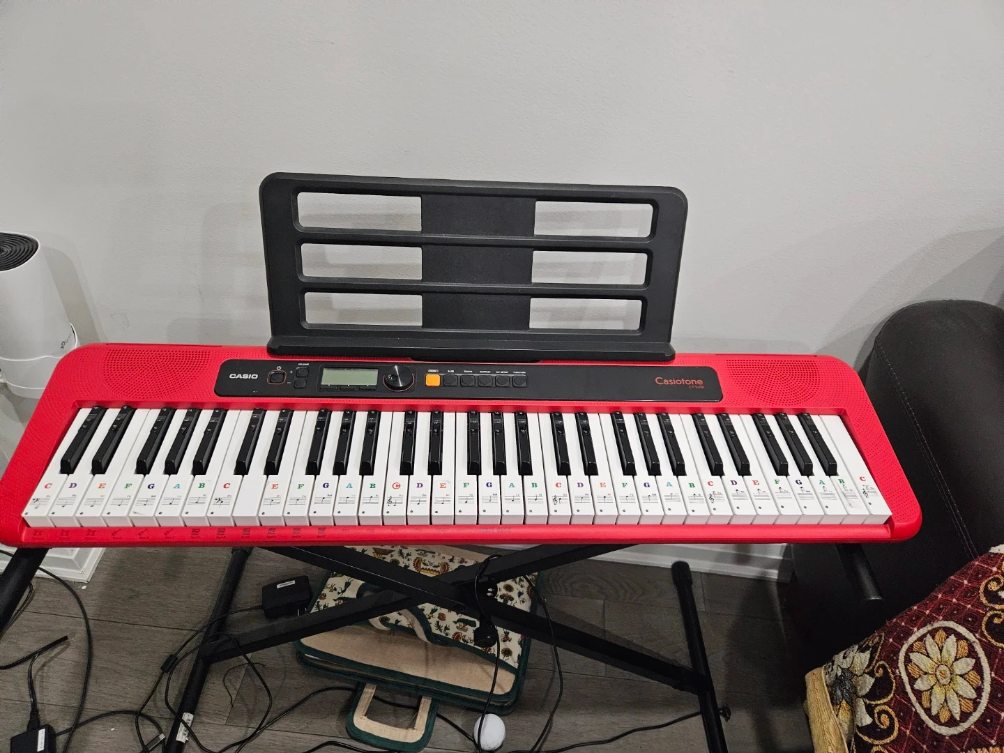 Casio Casiotone CT-S200 portable keyboard in a bright red colour. It has 61 keys with note stickers. Includes a music stand. Great for beginners learning to play!
