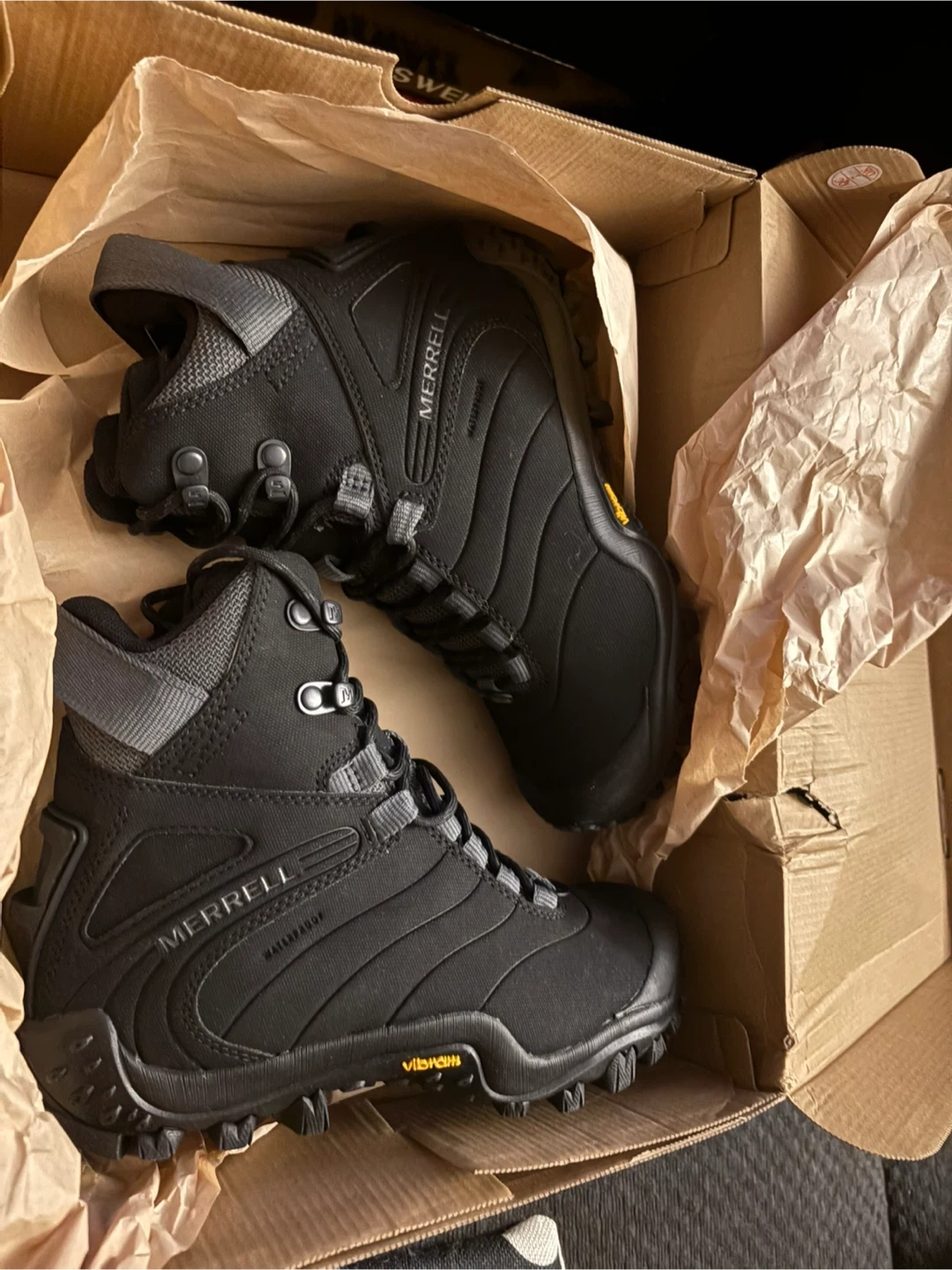I'm selling a pair of new Merrell Cham 8 Thermo Tall Waterproof winter boots in women's size 5.5, perfect for braving the cold and snow with confidence. These boots feature a durable waterproof construction and excellent traction for winter conditions. They are brand new in box!