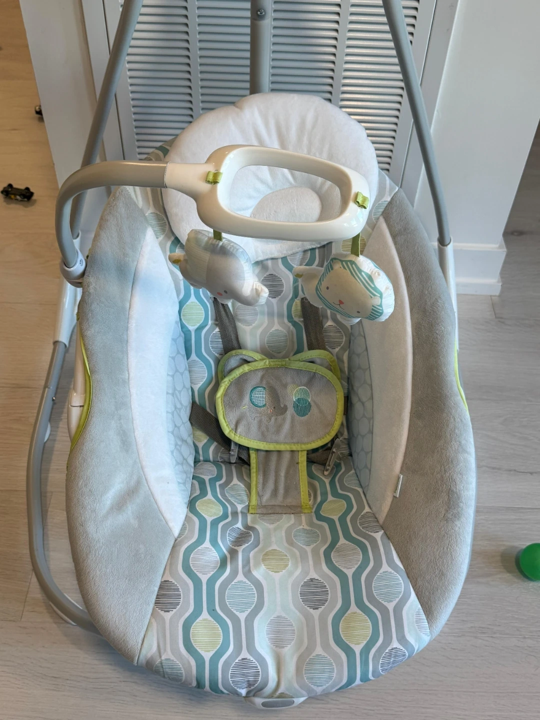 The toy arch with plush toys broke at the joint and has been repaired with super glue. It is currently attached but may be fragile, so consider it a bonus accessory rather than a main feature.