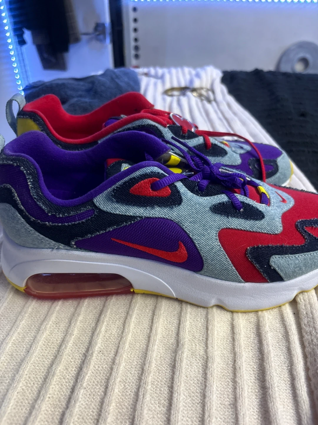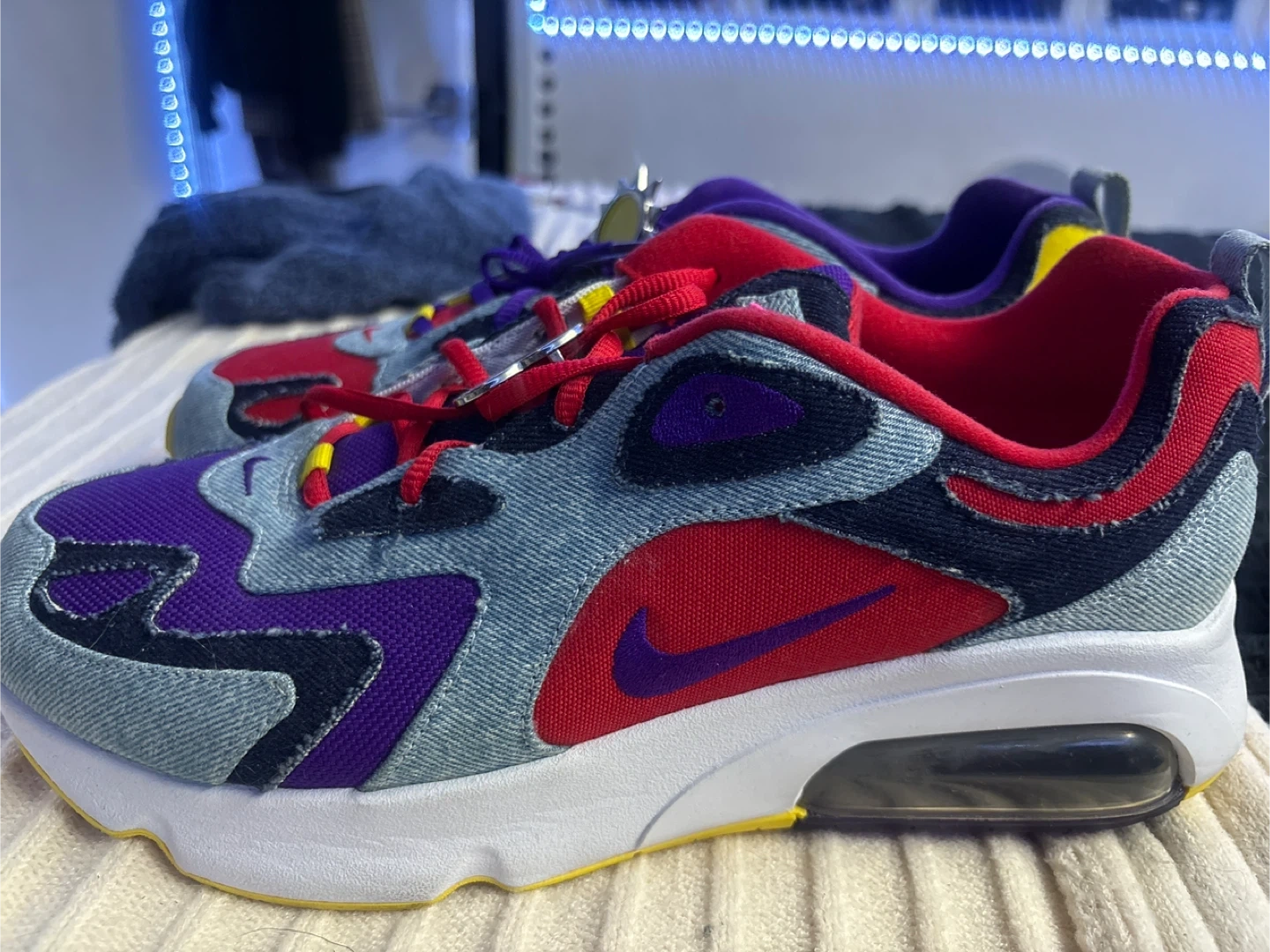Nike Air Max 200 sneakers in a denim mix colorway. Features red, purple, and yellow accents with visible air cushioning. These shoes are a size 10.5