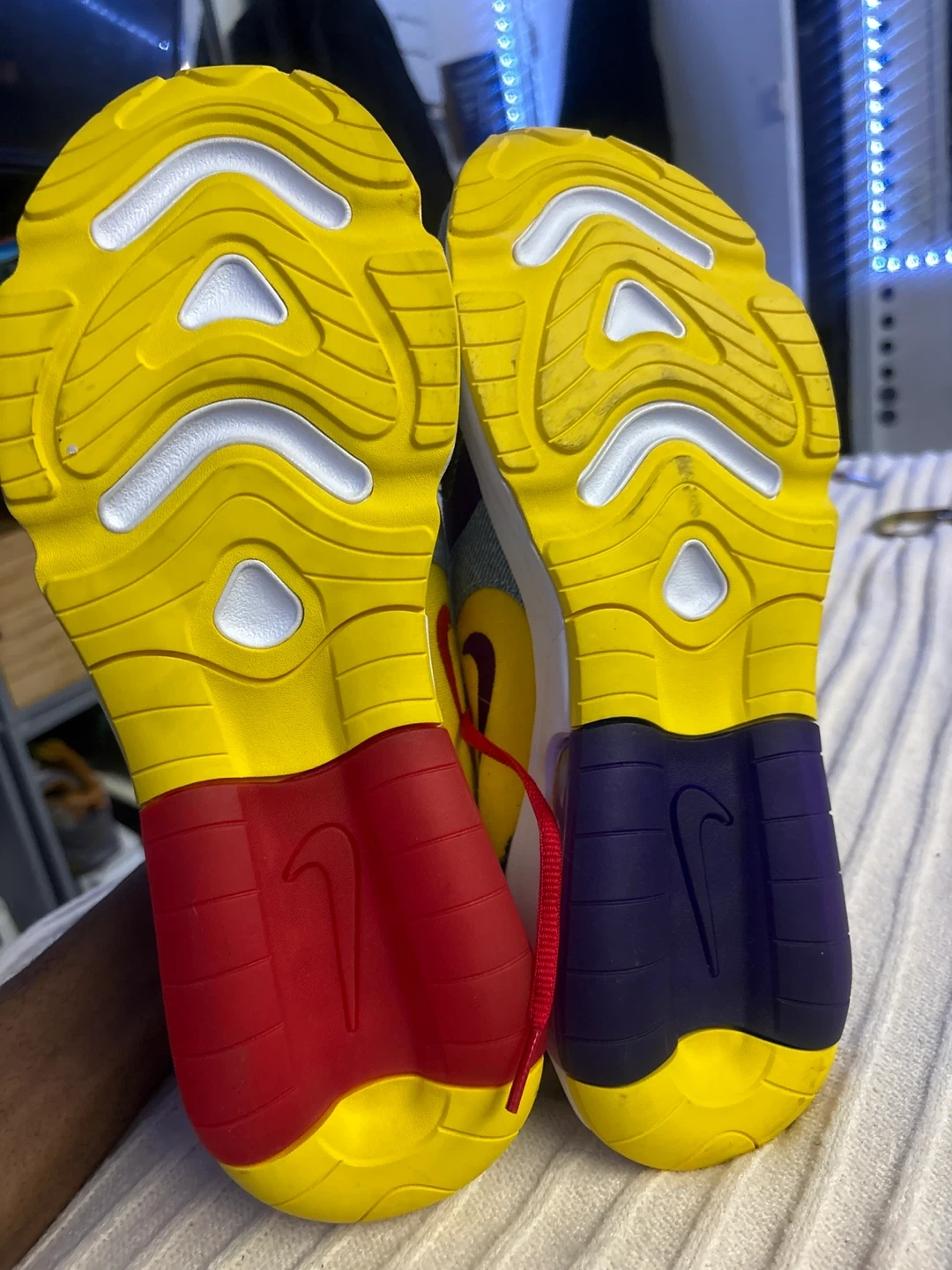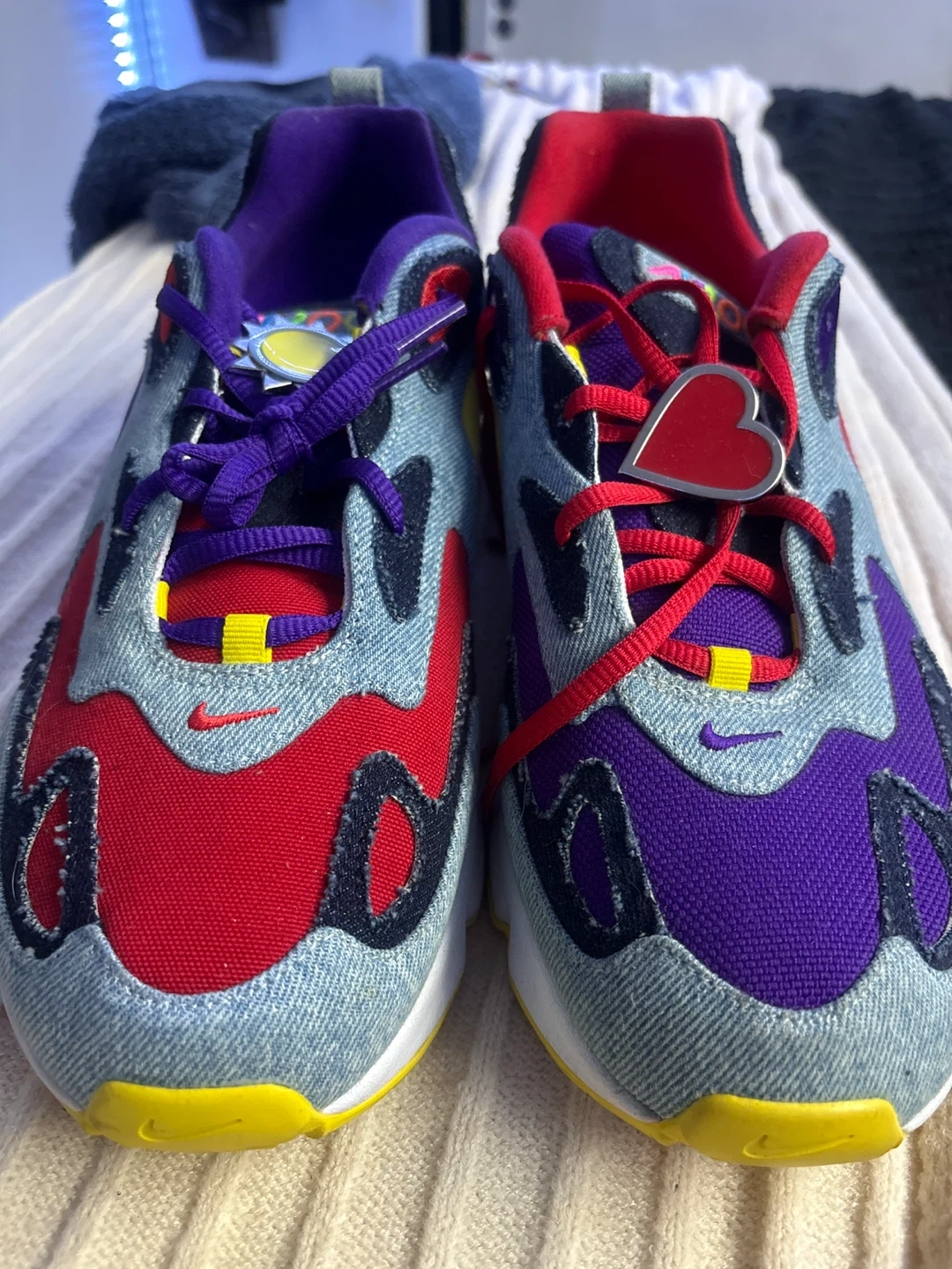 Nike Air Max 200 sneakers in a denim mix colorway. Features red, purple, and yellow accents with visible air cushioning. These shoes are a size 10.5