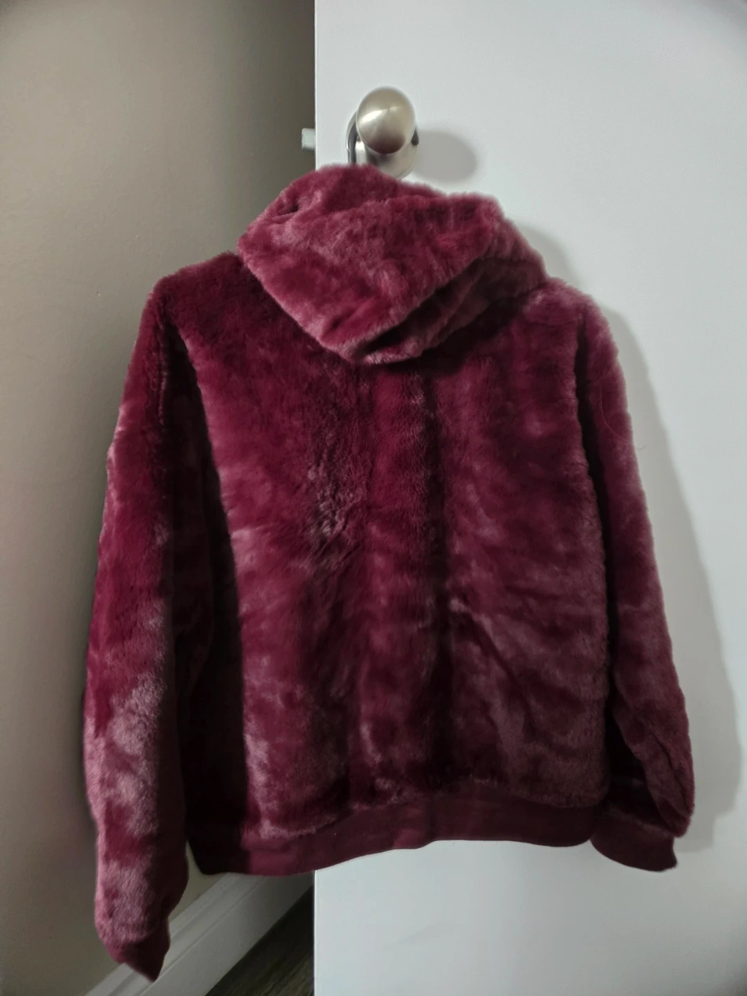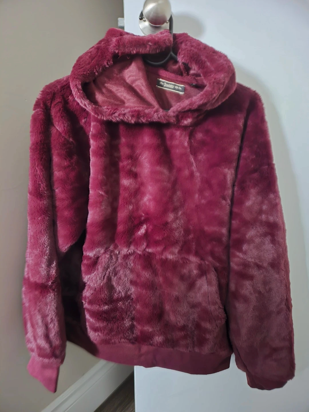 Super soft and cozy burgundy plush faux fur hoodie. It's a relaxed fit with a front kangaroo pocket. This hoodie is perfect for staying warm on chilly days!