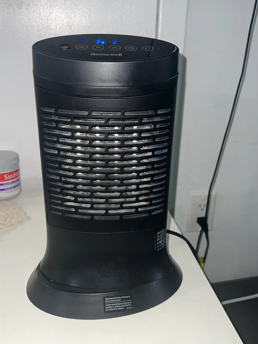 Black colour. Compact size, perfect for personal use. It has multiple heat settings and a fan-only option.