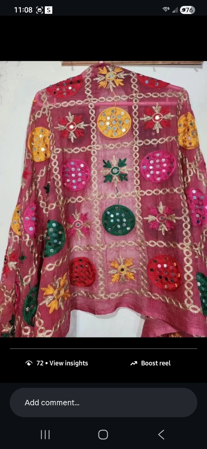 This is a richly embroidered dupatta with colorful circular and floral patterns, accented with small mirror pieces. It's a beautiful accessory to liven up any outfit. The fabric appears to be a lightweight sheer material.