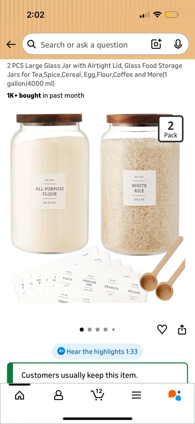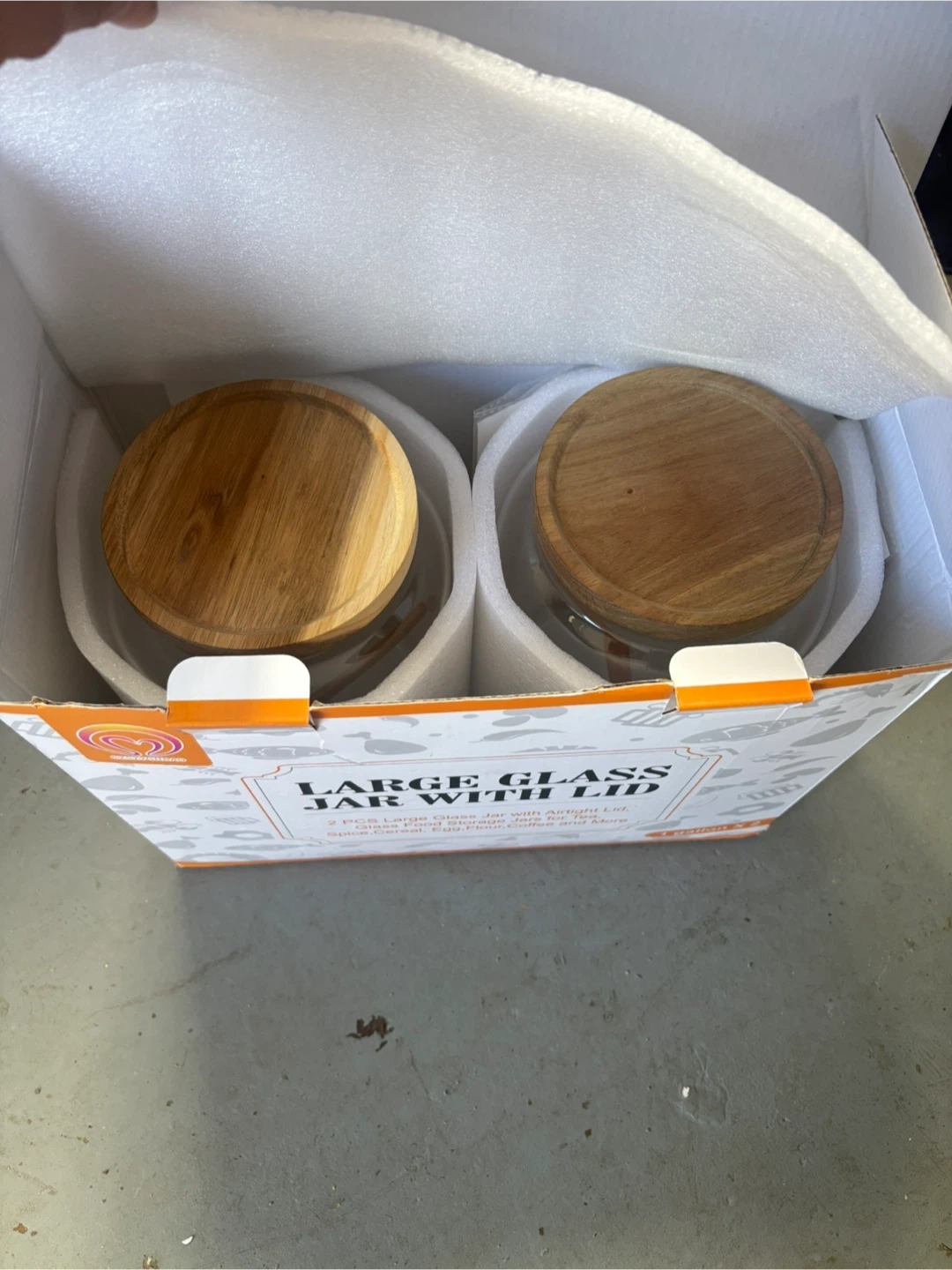 Set of two large glass jars, each holding 1 gallon. They come with natural acacia wood lids for an airtight seal and include wooden spoons. Great for storing dry goods like flour, cereal, or coffee.