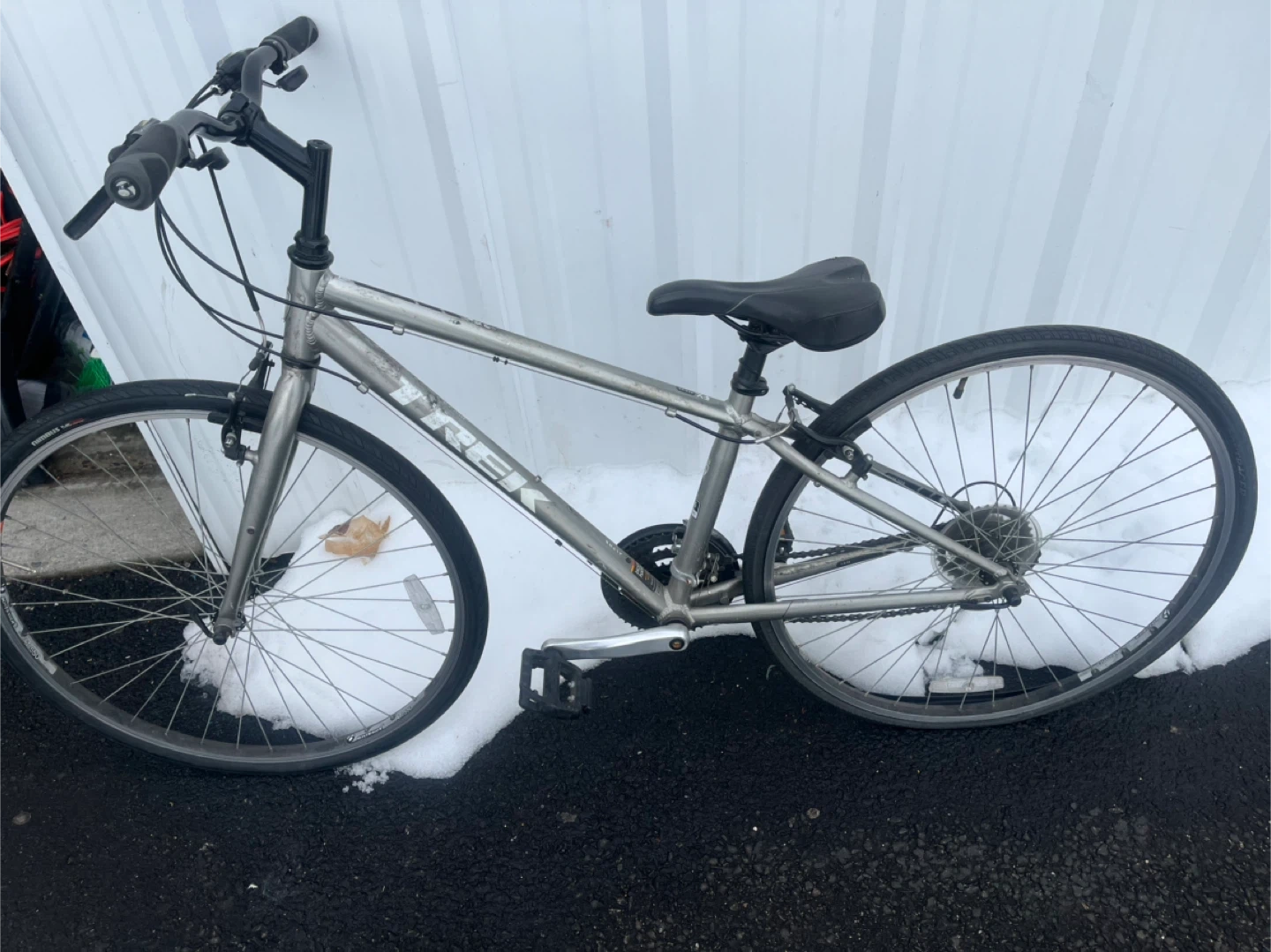 Silver Trek FX Series hybrid bike. Frame size is 15 inches (38cm). It's a versatile bike for commuting or recreational riding.