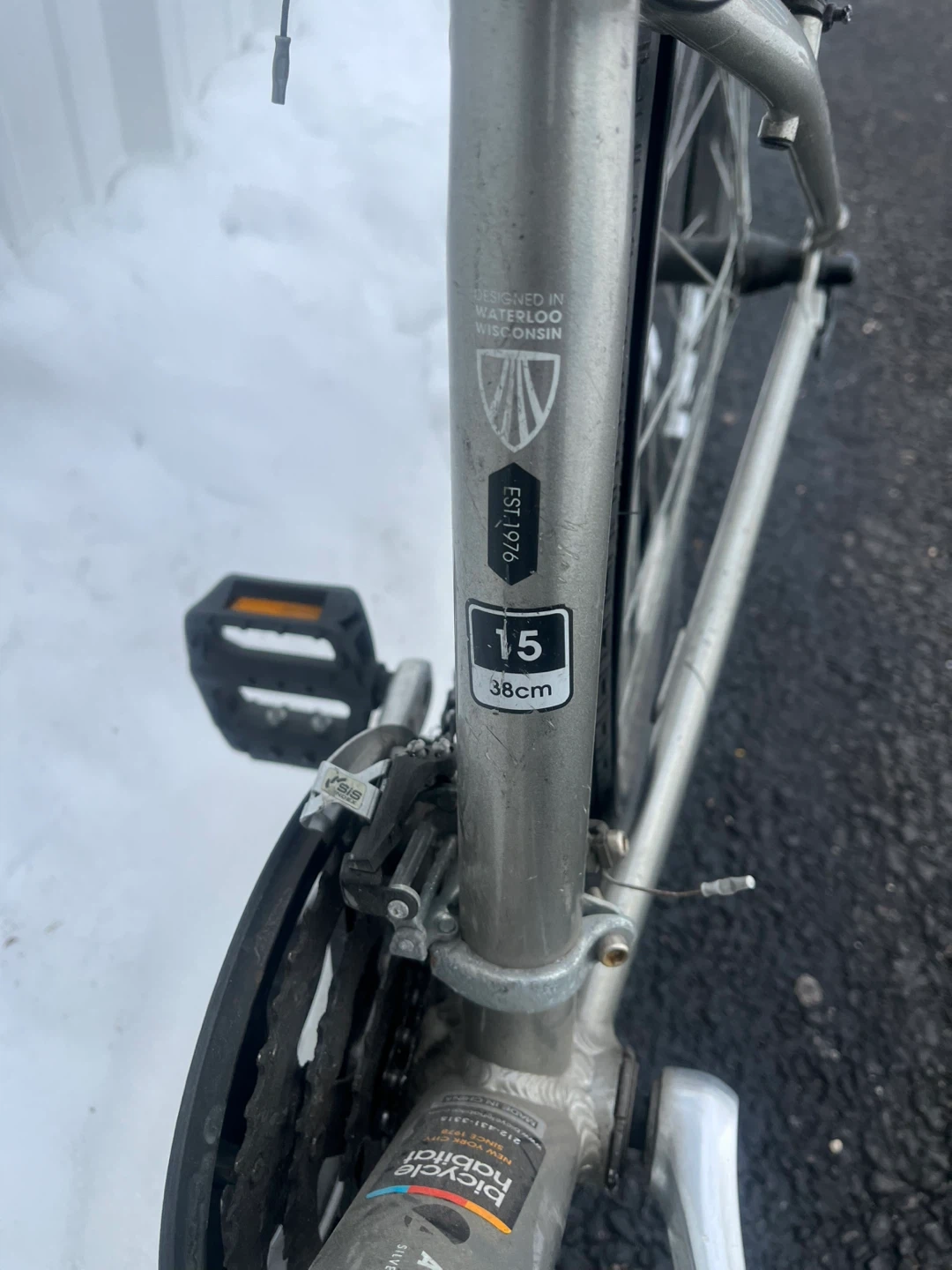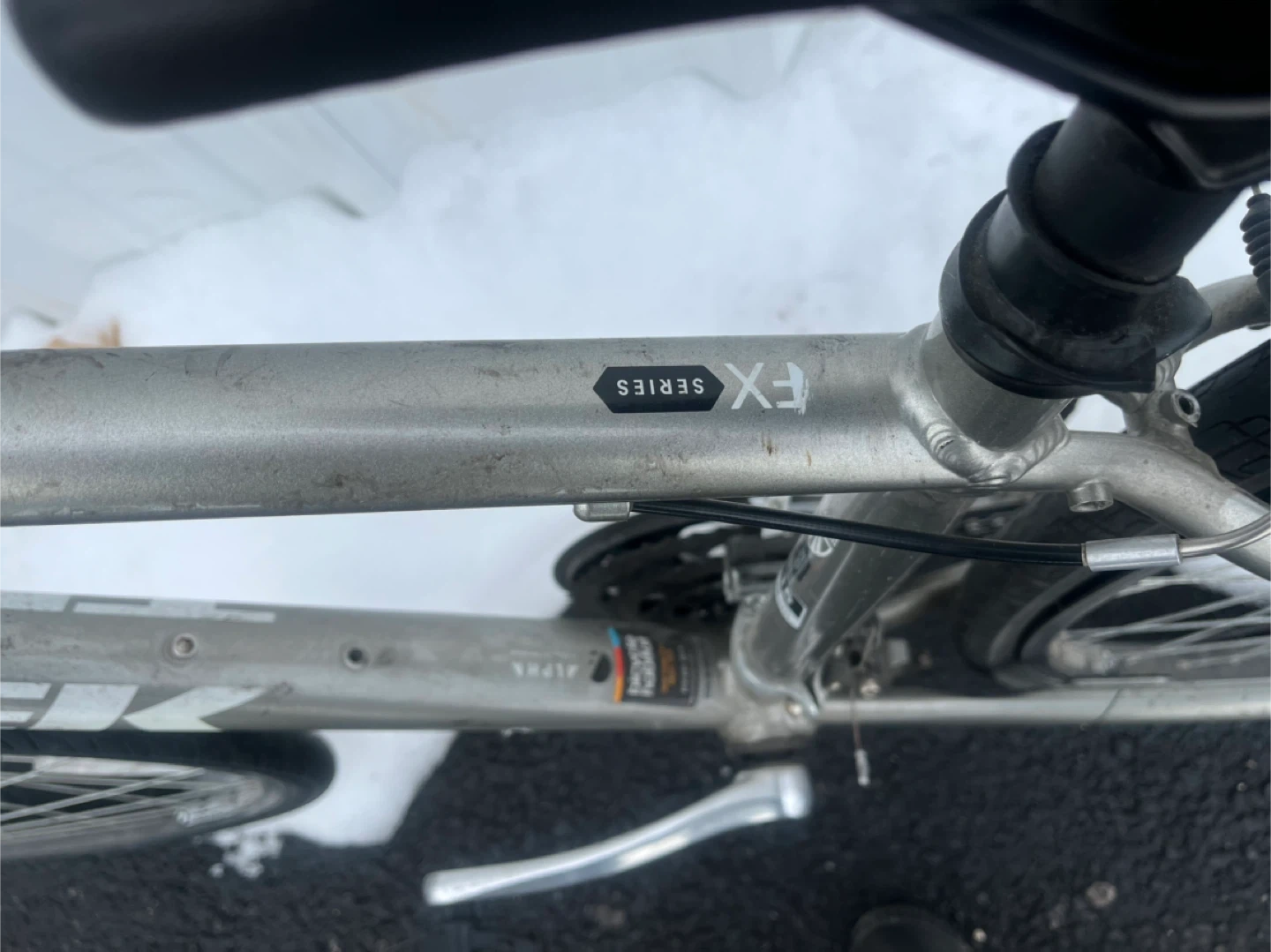 Silver Trek FX Series hybrid bike. Frame size is 15 inches (38cm). It's a versatile bike for commuting or recreational riding.