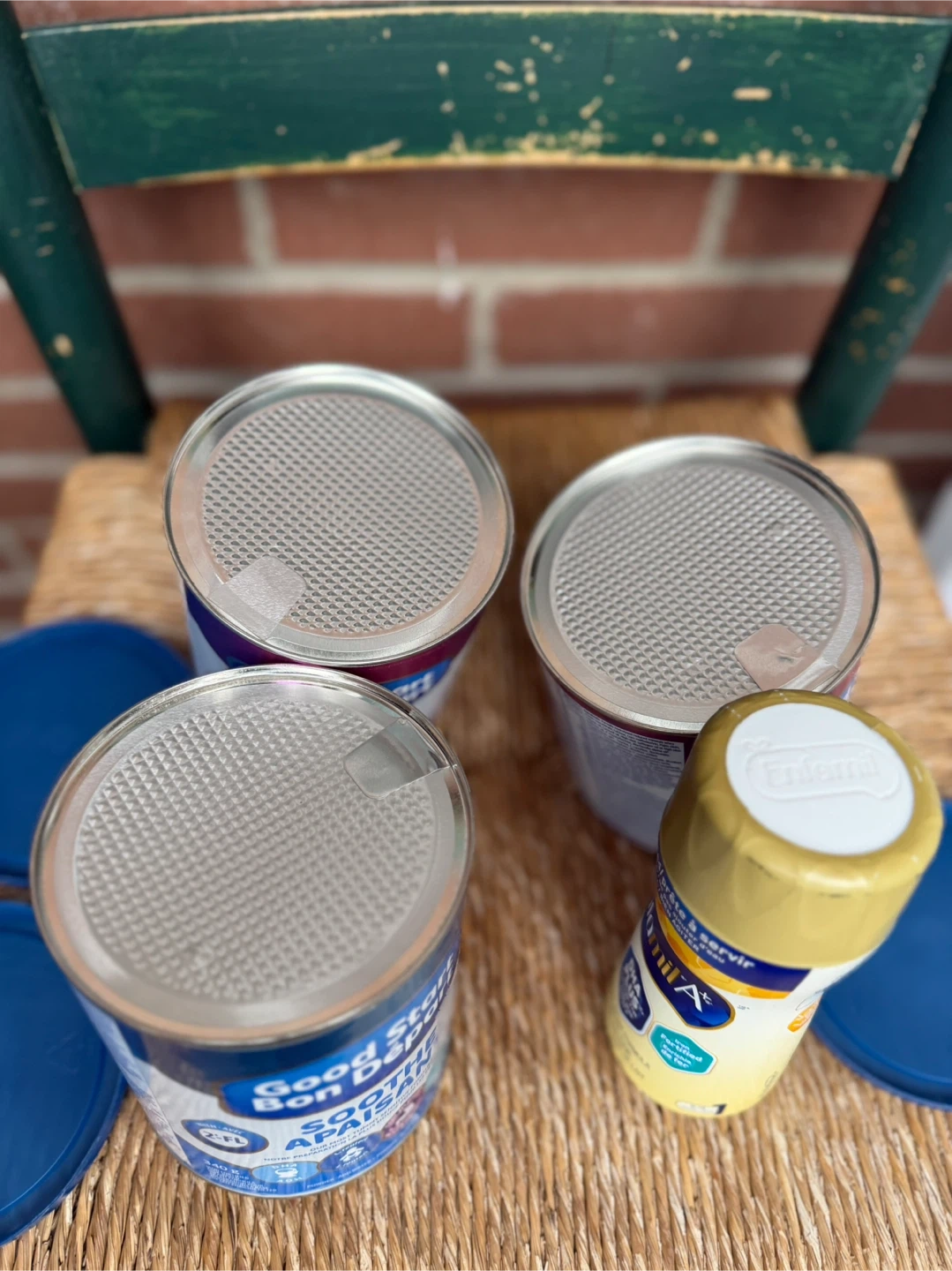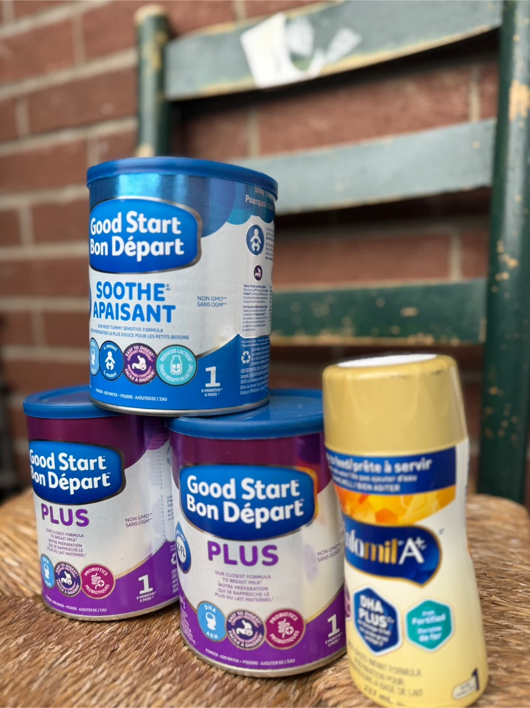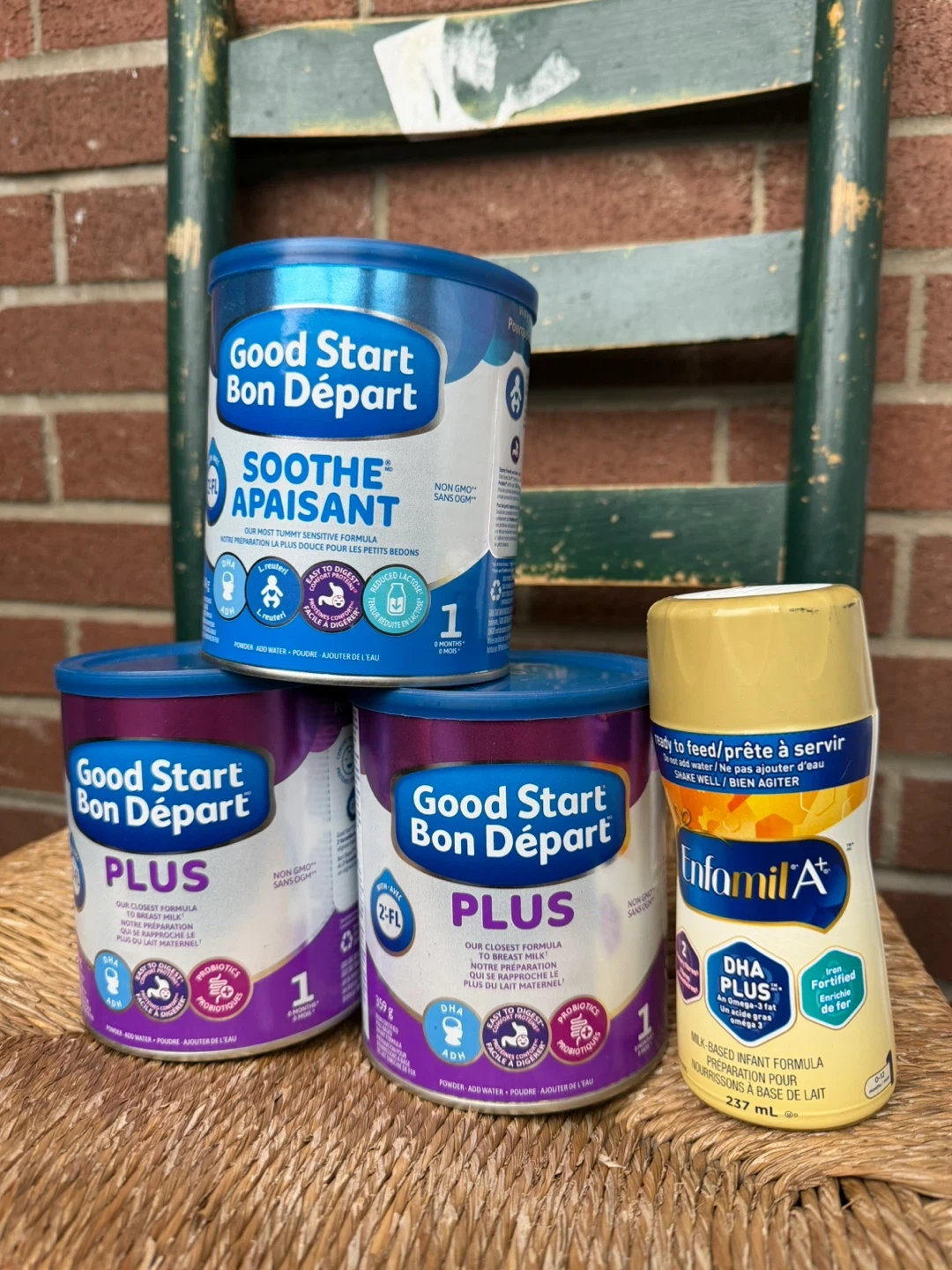 Three Good Start Bon Départ cans, including one Soothe (Jan 2027) and two Plus formulas(May 2026). Also includes one Enfamil A+ ready-to-feed bottle.