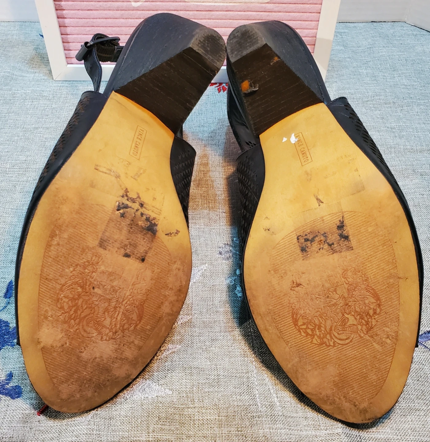 These Vince Camuto heels are a size 10 and feature a stylish black perforated design with a slingback strap. They're made from synthetic leather. The heel height is approximately 3.5 inches. Used only once.