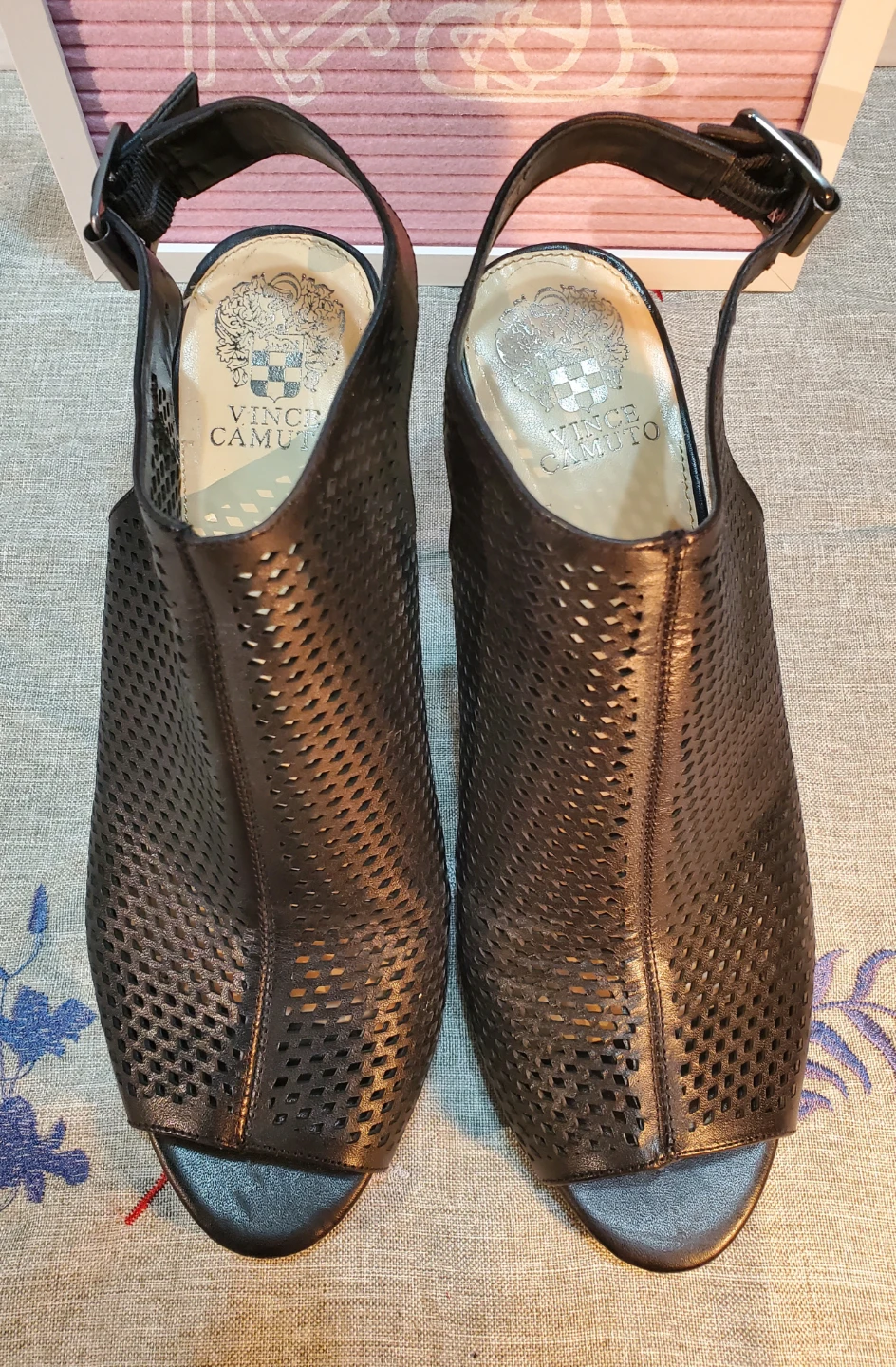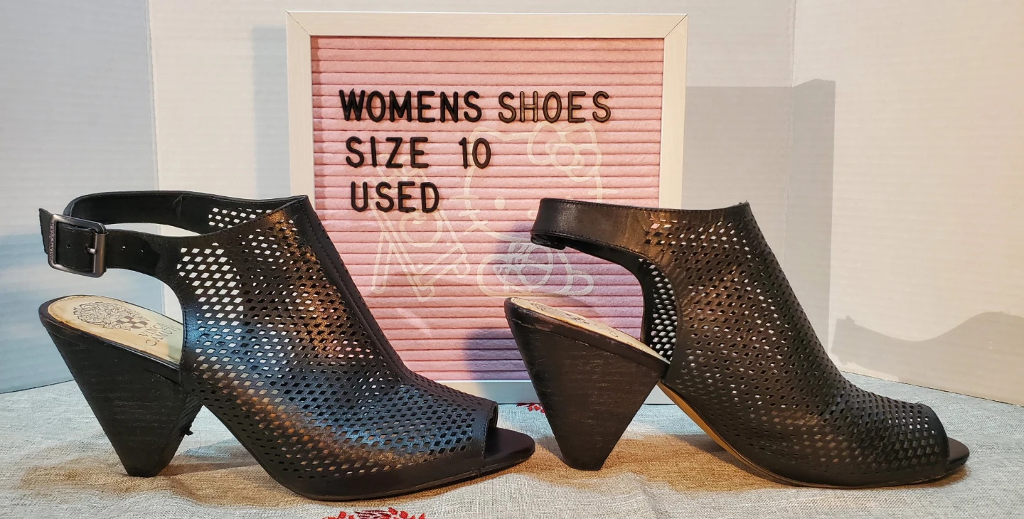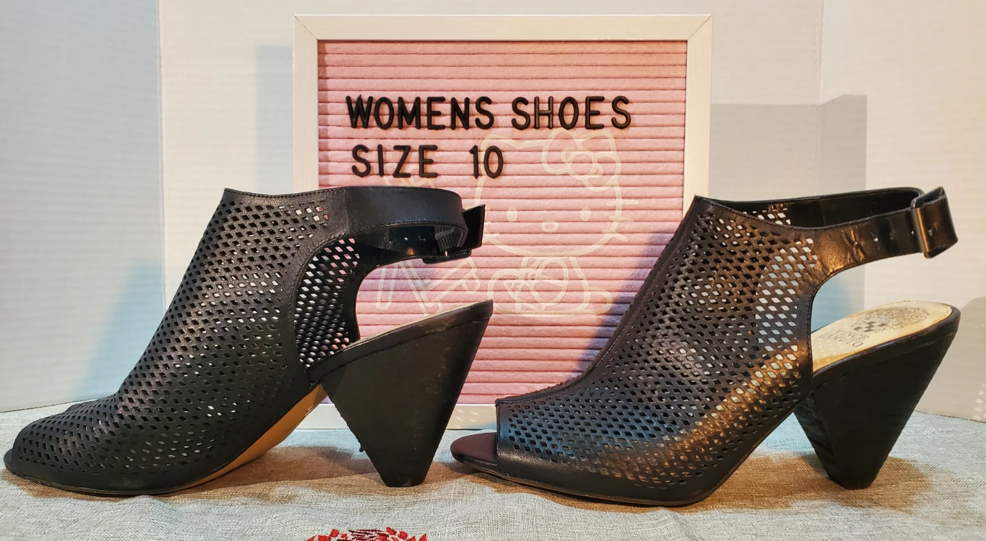 These Vince Camuto heels are a size 10 and feature a stylish black perforated design with a slingback strap. They're made from synthetic leather. The heel height is approximately 3.5 inches. Used only once.