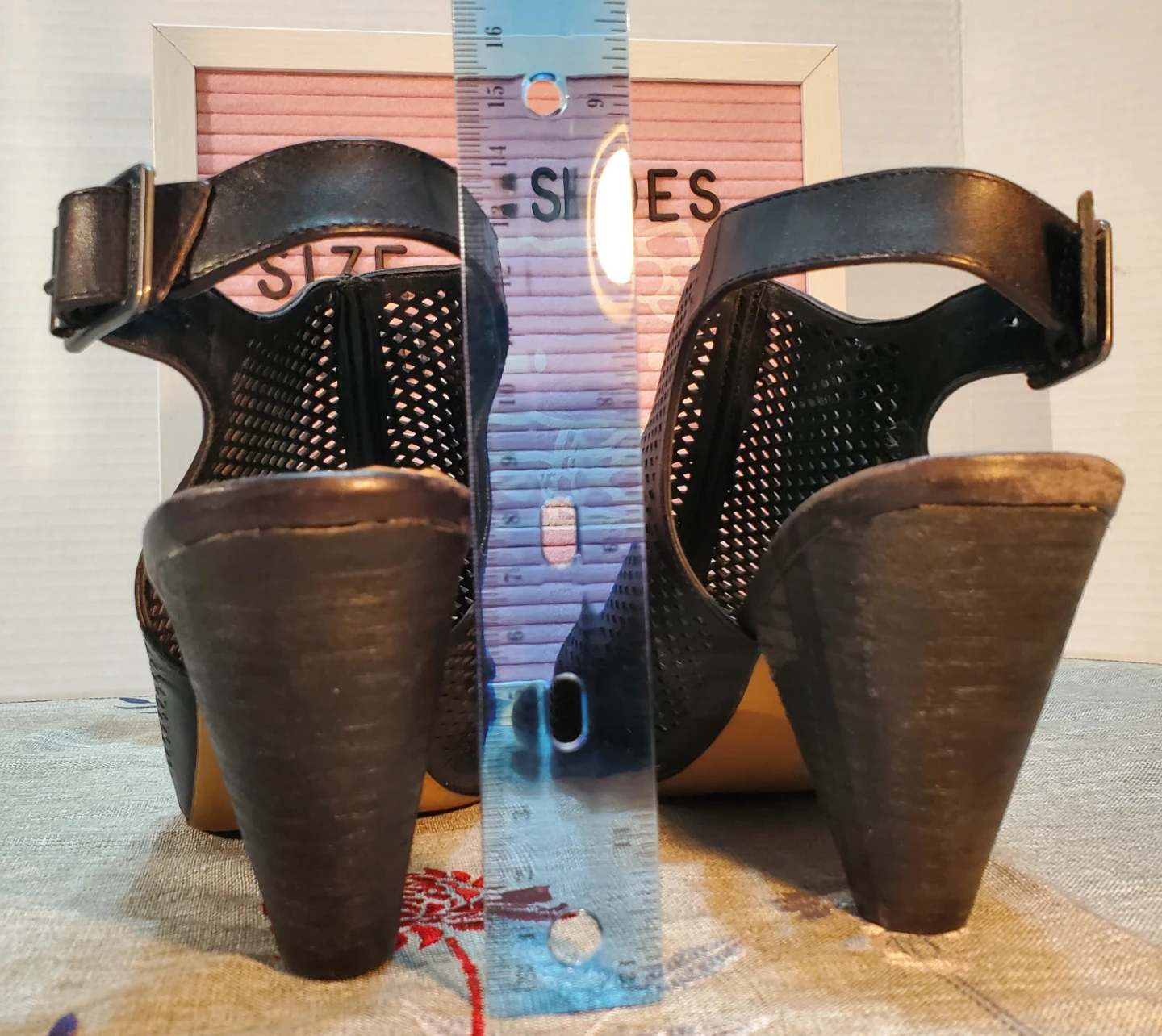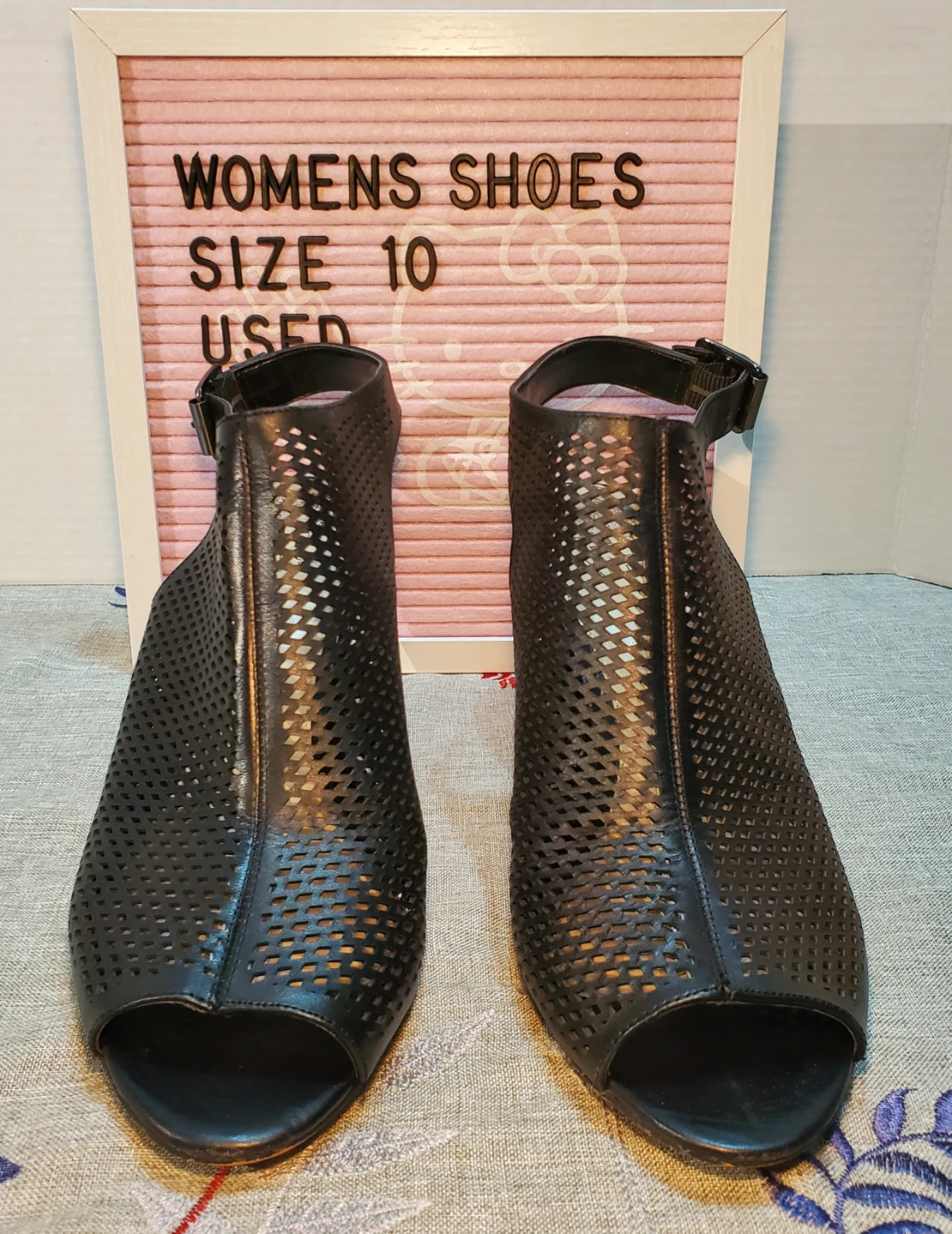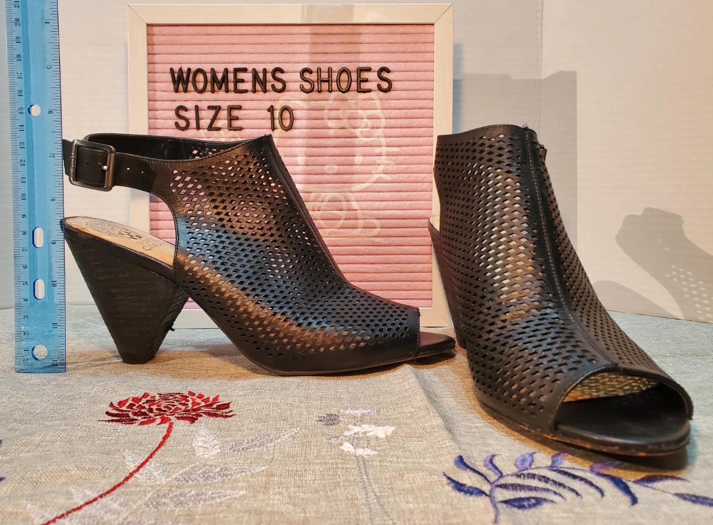 These Vince Camuto heels are a size 10 and feature a stylish black perforated design with a slingback strap. They're made from synthetic leather. The heel height is approximately 3.5 inches. Used only once.