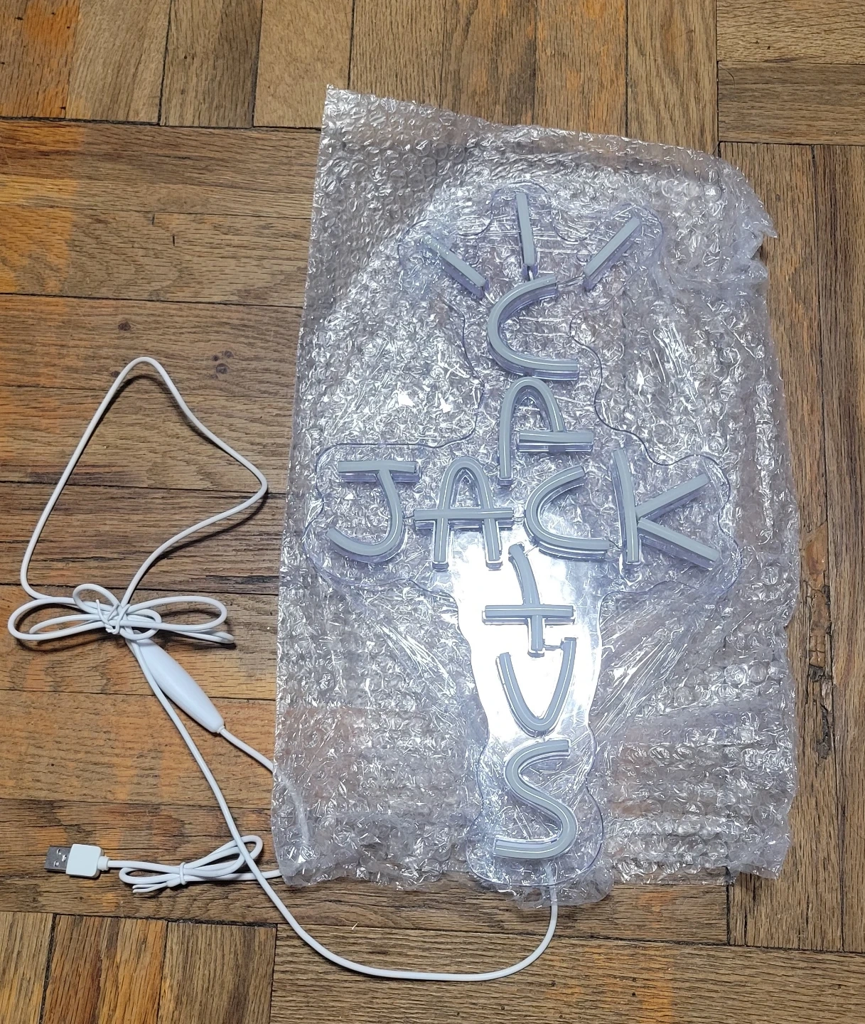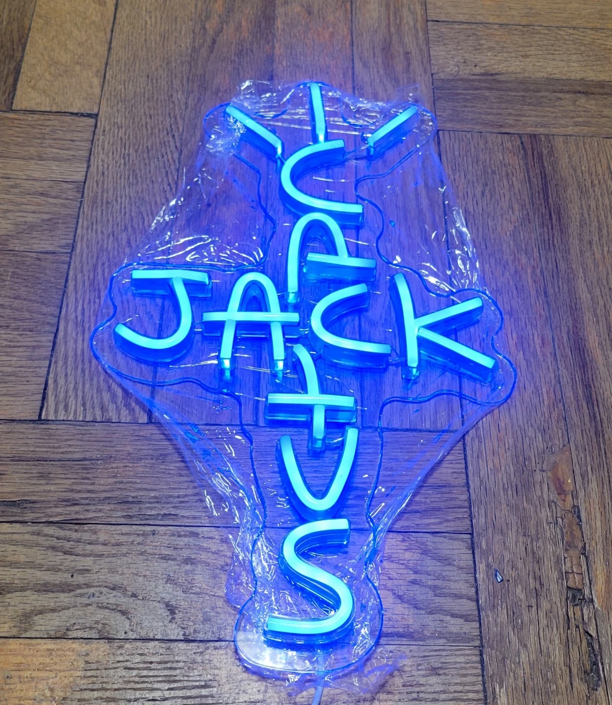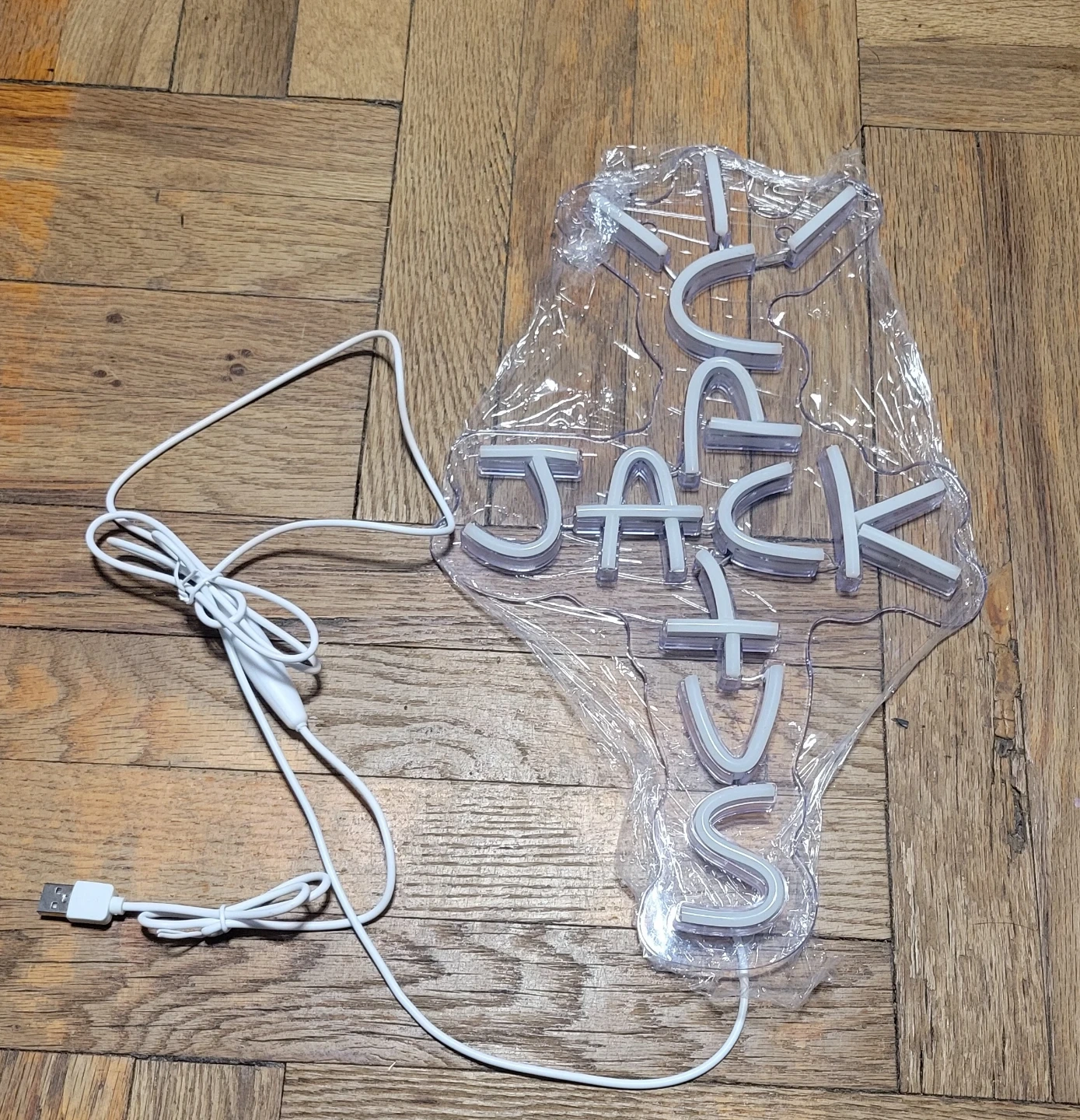 This is a USB-powered LED neon sign that spells out 'Cactus Jack'. It's designed for easy use with a simple USB connection. The sign emits a bright blue light when powered on.