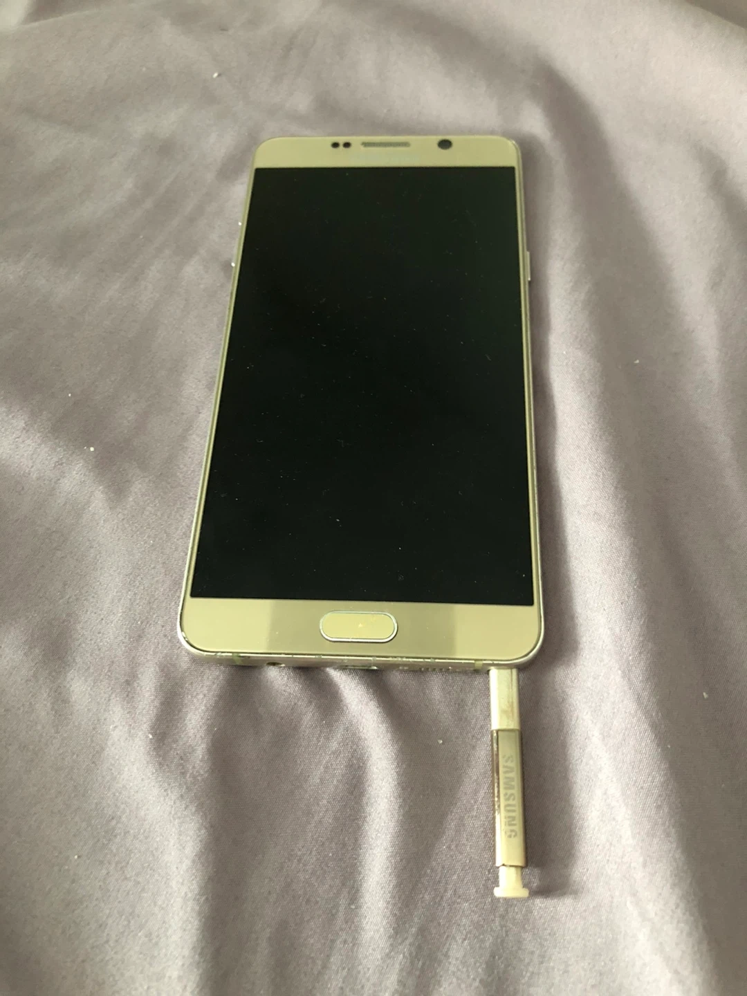 This is a gold Samsung Galaxy Note 5 smartphone. It includes its S Pen stylus. It's ready for setup!