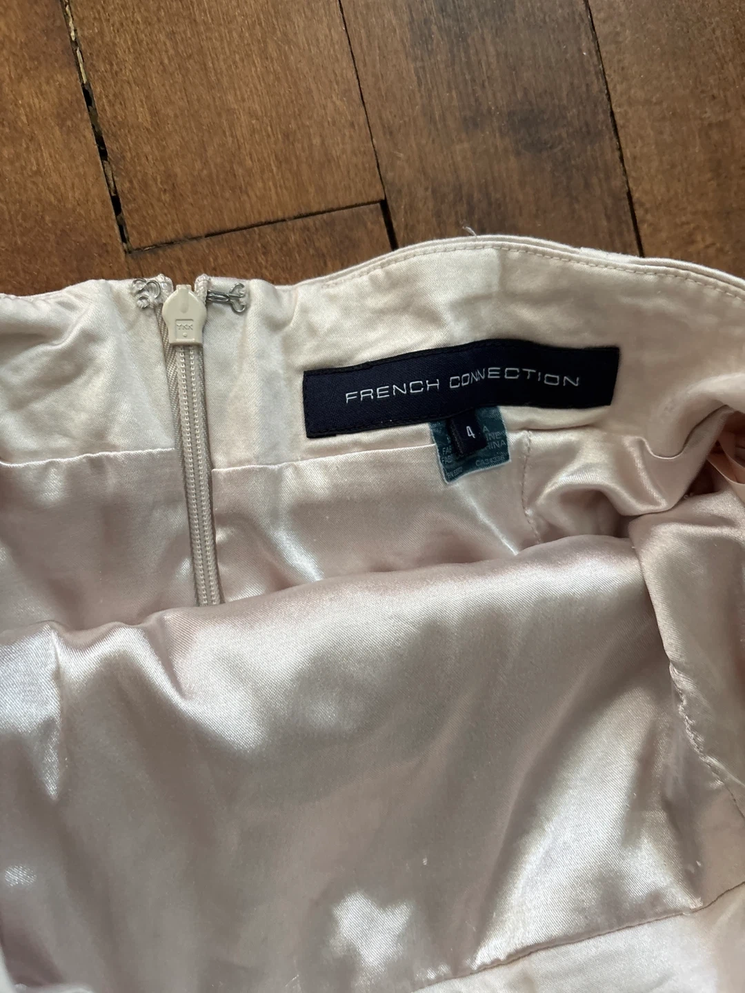 French Connection dress in size 4! The inner shell is 58% modal and 39% cotton with 3% elastane/spandex. The outer shell is 100% viscose/rayon and the lining is 97% polyester with 3% elastane/spandex