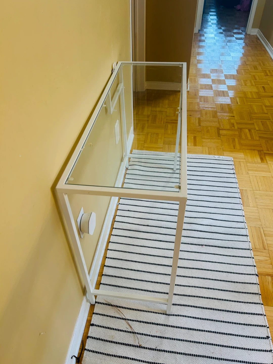 White metal frame console table with a glass top. It's suitable for entryways or narrow spaces. The table is simple and modern in design.