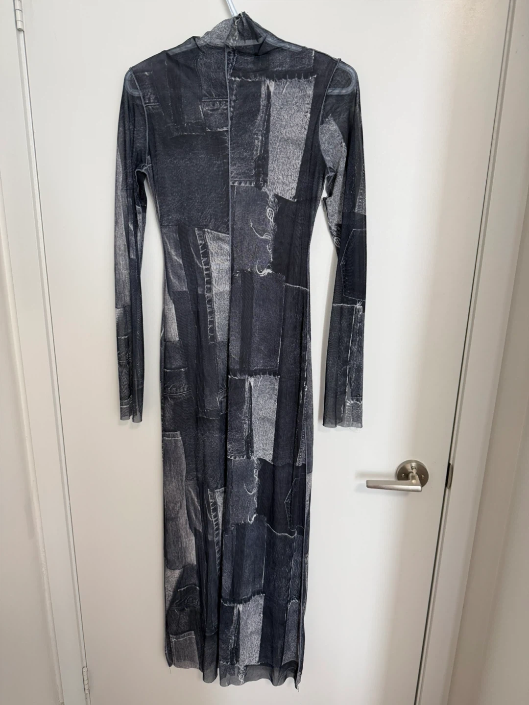 Grey patchwork print sheer mock neck dress. Long sleeves with a slim fit. Lining underneath. There's a small snag on the seam.